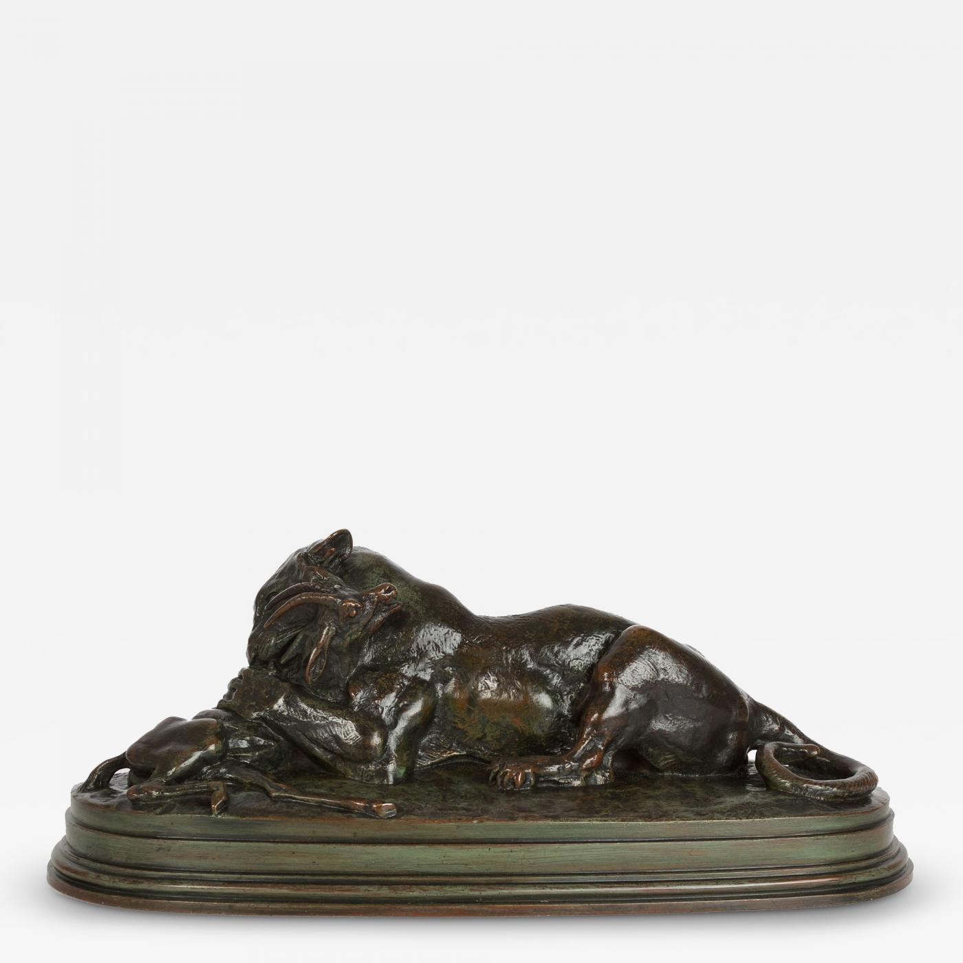 Item # 110KRT23A A fine Barbedienne casting after Barye's "Tiger Devouring a Gazelle", it was modeled in two versions: the first with a more impressionistic sense of texture, being markedly more brutal with the gazelle's intestines strewn on the ground; and the present model with its greater surface and subject refinement. The parallels between Tigre Dévourant une Gazelle and Tigre Dévorant un Gavial are self-evident as an exploration of the tiger's mannerisms. Particularly interesting is the degree of intensity and overall ferocity from one model to the other, the latter showing the tension of a battle yet fully decided while the present model is more relaxed and final.