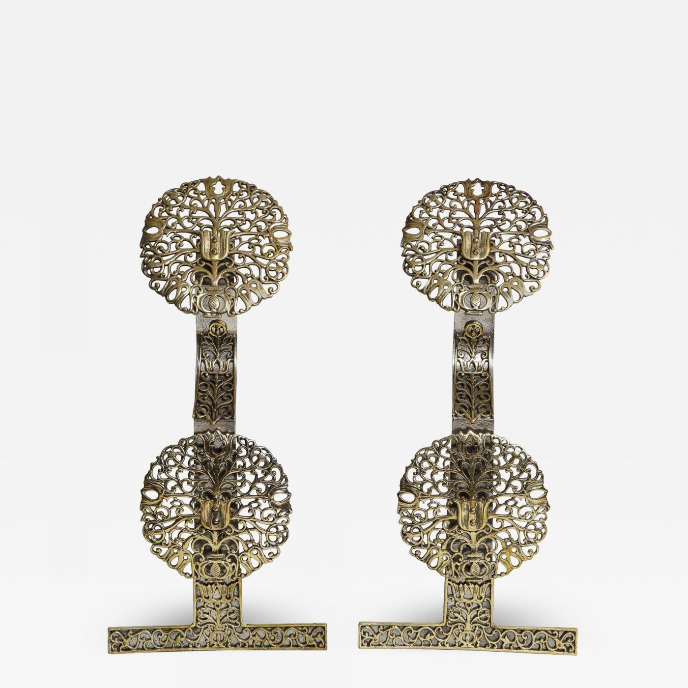 Fine pair of English Arts & Crafts andirons having pierced brass filigree finials and bosses and applied pierced brass mounts reminiscent of the tree of life.
