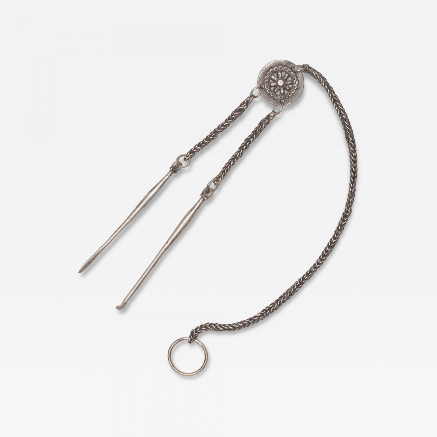 A small Chinese chatelaine tool set strung with a petite white brass spoon and scraper tool. The small tools hang from a charm shaped as the "Wheel of Life," a Buddhist symbol of eternity. Suspended from one's clothing at the shoulder, back, or waist, a tool set such as this was used for a variety of daily tasks, such as personal grooming, taking snuff, or cleaning opium accessories.