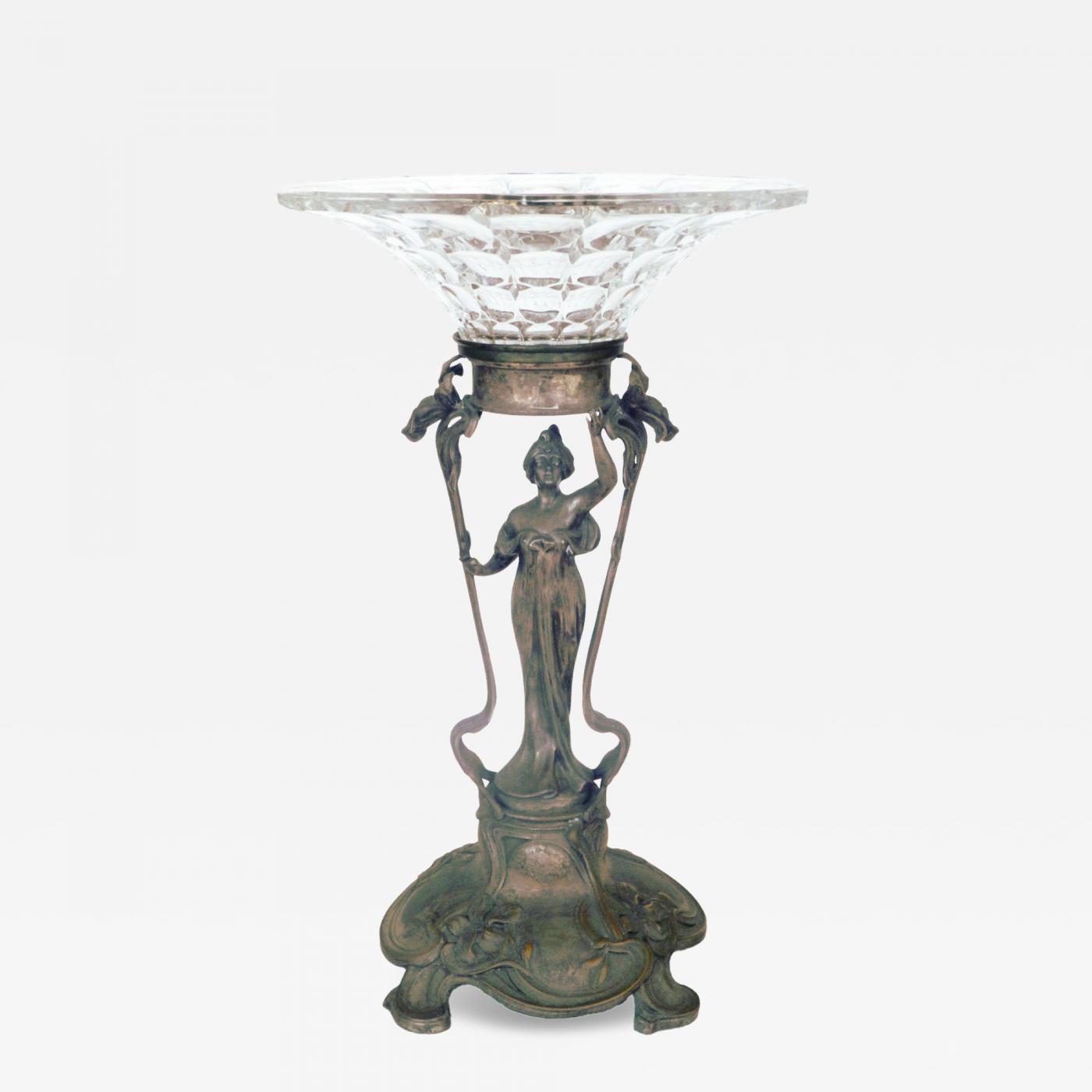 WMF Silver Plate Art Nouveau Woman Holding Glass Dish Over Her Head Circa 1900