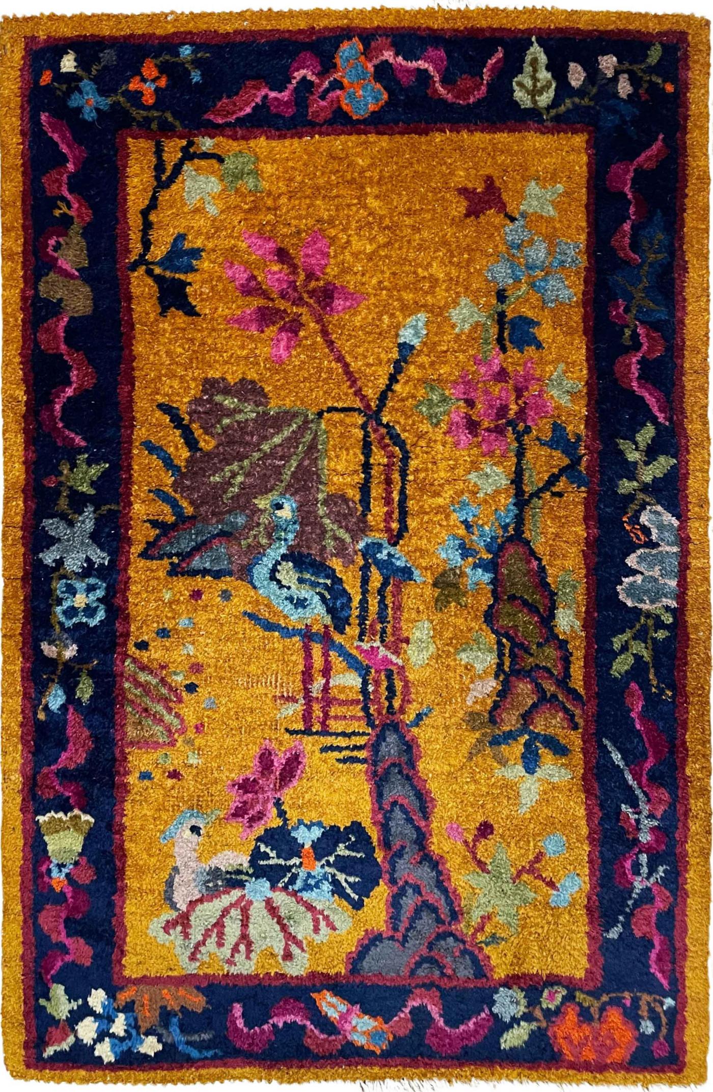 Measuring 2' x 3', this rug's versatile size makes it an ideal addition to your rooms alike. Its story is interwoven with the legacy of Walter Nichols, a renowned American rug producer in Tientsin. The rugs he produced, though not originating the Art Deco style, embraced it with a blend of wool and silk, bringing to life bold, vibrant colors and pictorial scenes that included trees, birds, clouds, mountains, dragons, butterflies, and flowers.