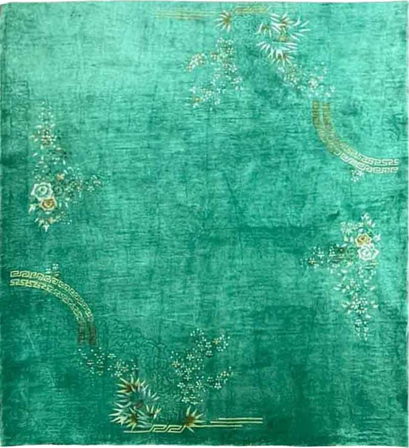 This wonderful Art Deco carpet was made in China, circa 1910s or 1920's. Walter Nichols was great American rug producer (the Art Deco rugs which he did not originate them) in Tientsin. The rugs made of wool and silk with bold vibrant colors and the pattern are pictorial scenes and trees, birds, clouds, mountains, dragons, butterfly and flowers. The production of Art Deco rugs started from 1910s-1950s and mostly with western influence. - More Information