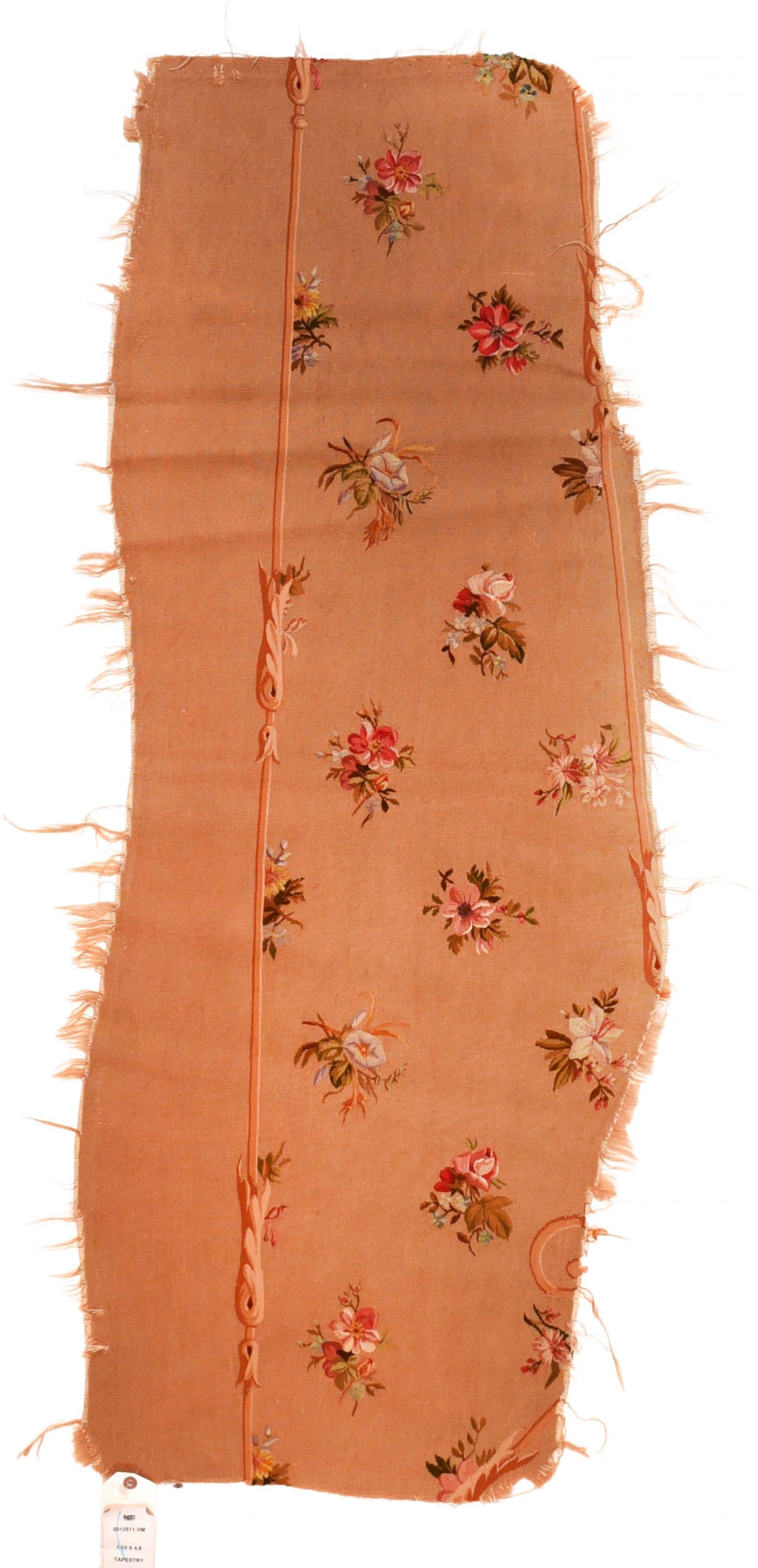 With a buff-beige field displaying rose and other flower bunches, with an adjoining plain section. Probably a covering for a settee. Ecru, green and rust details. Rough along one edge, but generally fairly good condition.