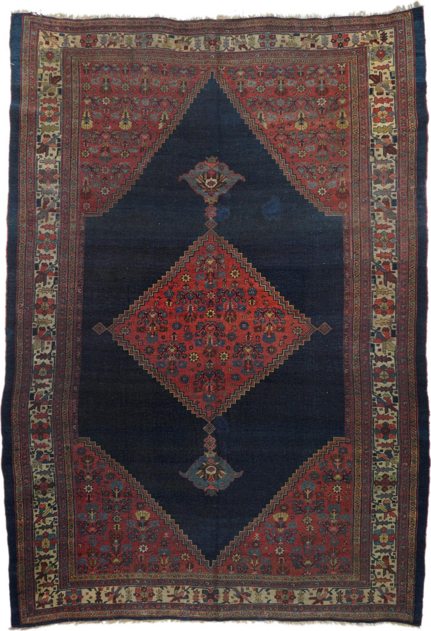 The open navy field shows off the red, stepped medallion with light blue pendants. A semi-geometric floral scatter decorates the medallion. Closely stepped en suite red corners. Beige Zanbaki border of square rosettes and tilted irises. All wool construction, late 19th century. Needs a stretch to even out the ends. Medium city weave. Good condition.