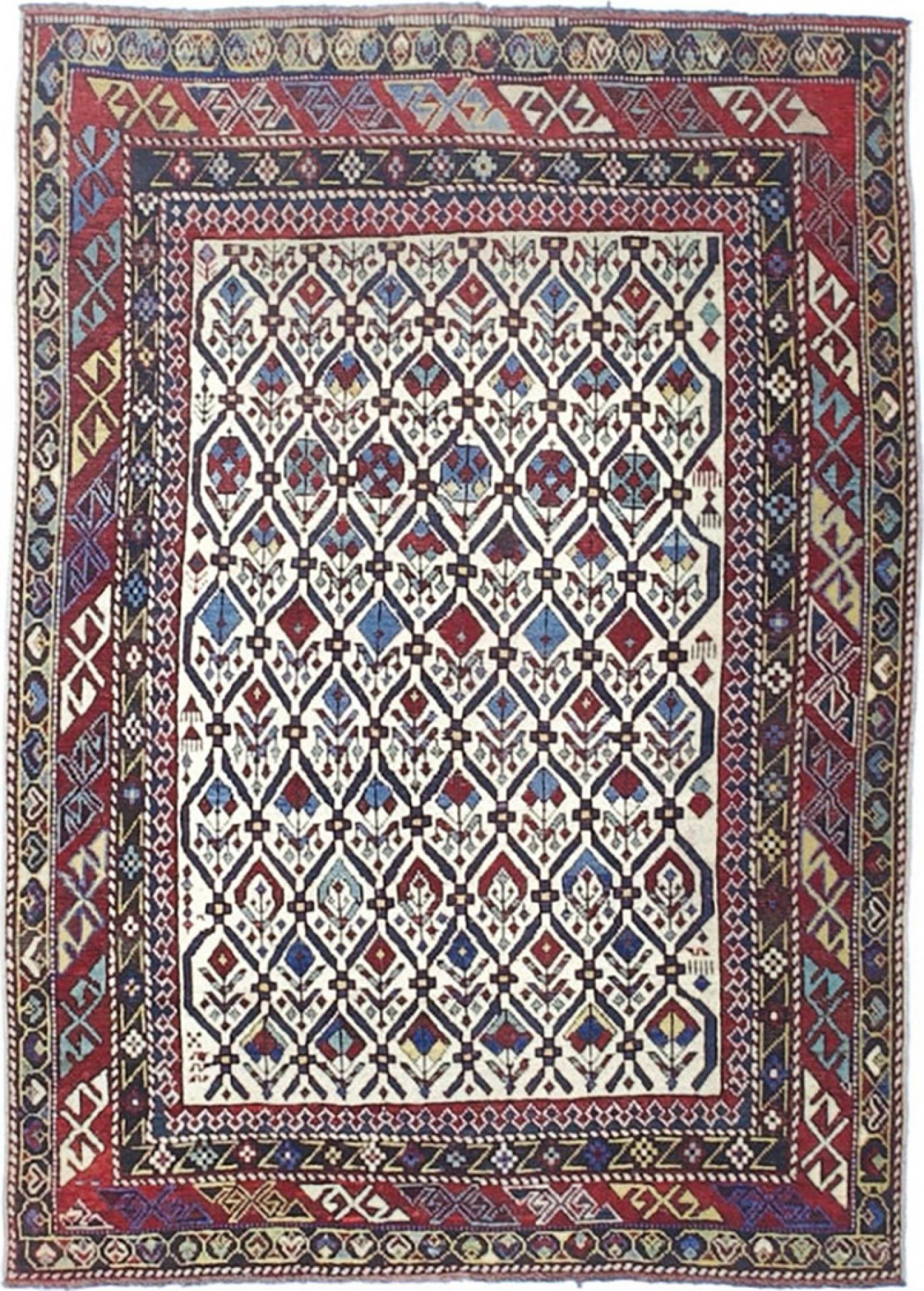 Eastern Caucasian, west Caspian Caucasian rugs, primarily scatters, in geometric layouts, some prayer, from a wide range of local villages. Marasali prayer rugs are considered as the best.. Some pictorials. Wool warps, often cotton wefts. Lowish pile, moderate to fine weaves. Natural dyes exclusively until 1890’s, then synthetics appear. Moderate to high priced.