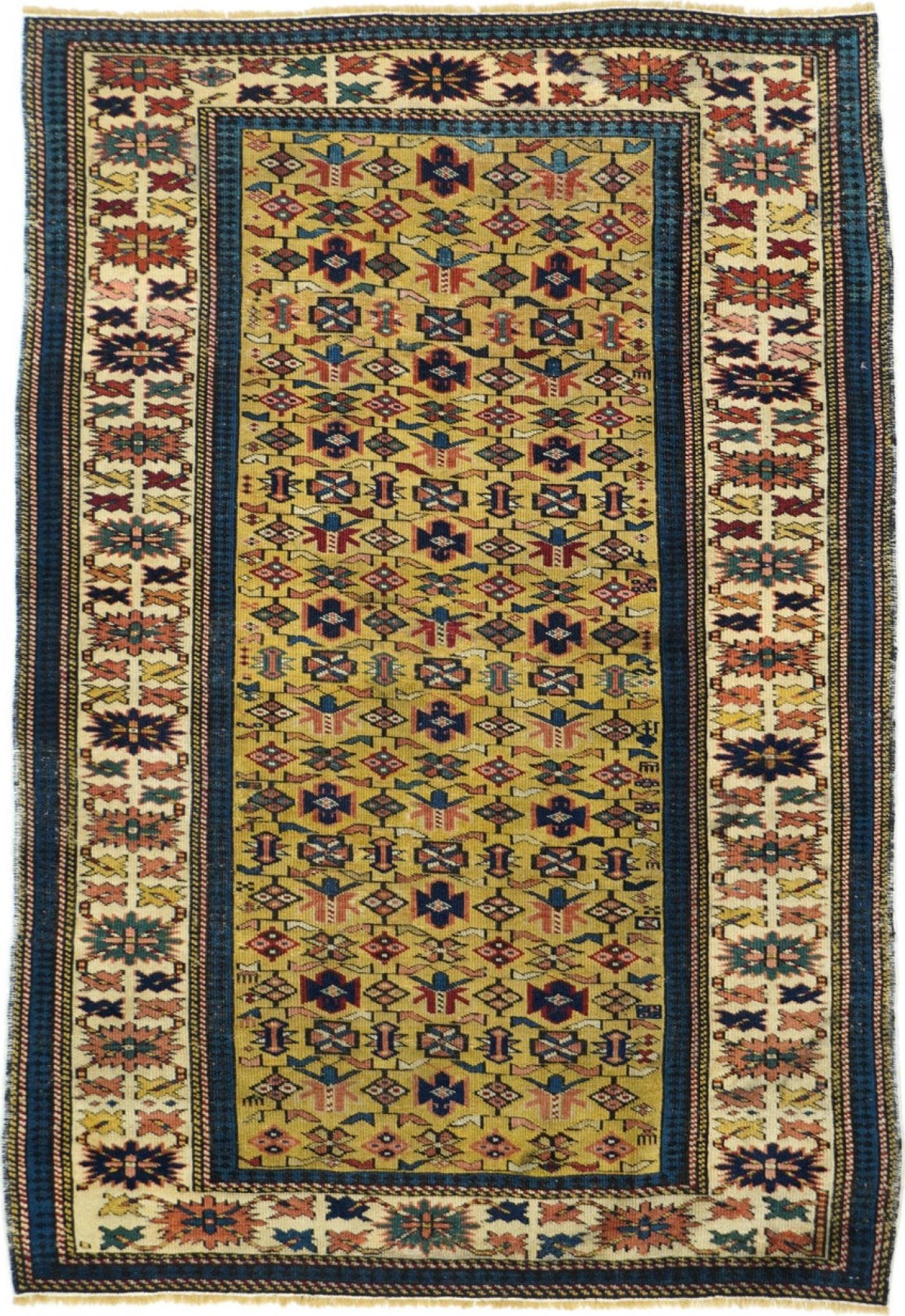Azeri Turks inhabit the Kuba area of the central west Caspian Caucasus and weave a wide variety of geometric scatters, runners, long rugs and niche (prayer) pieces, in geometric allover and medallion designs. Some flatweaves in kilim/tapestry and Sumak (weft-wrapping) techniques are also woven. Numerous identified types/villages: Zeychur, Alpan, Chi-chi, etc. Generally all-wool, moderate to medium weave. Colorful.
