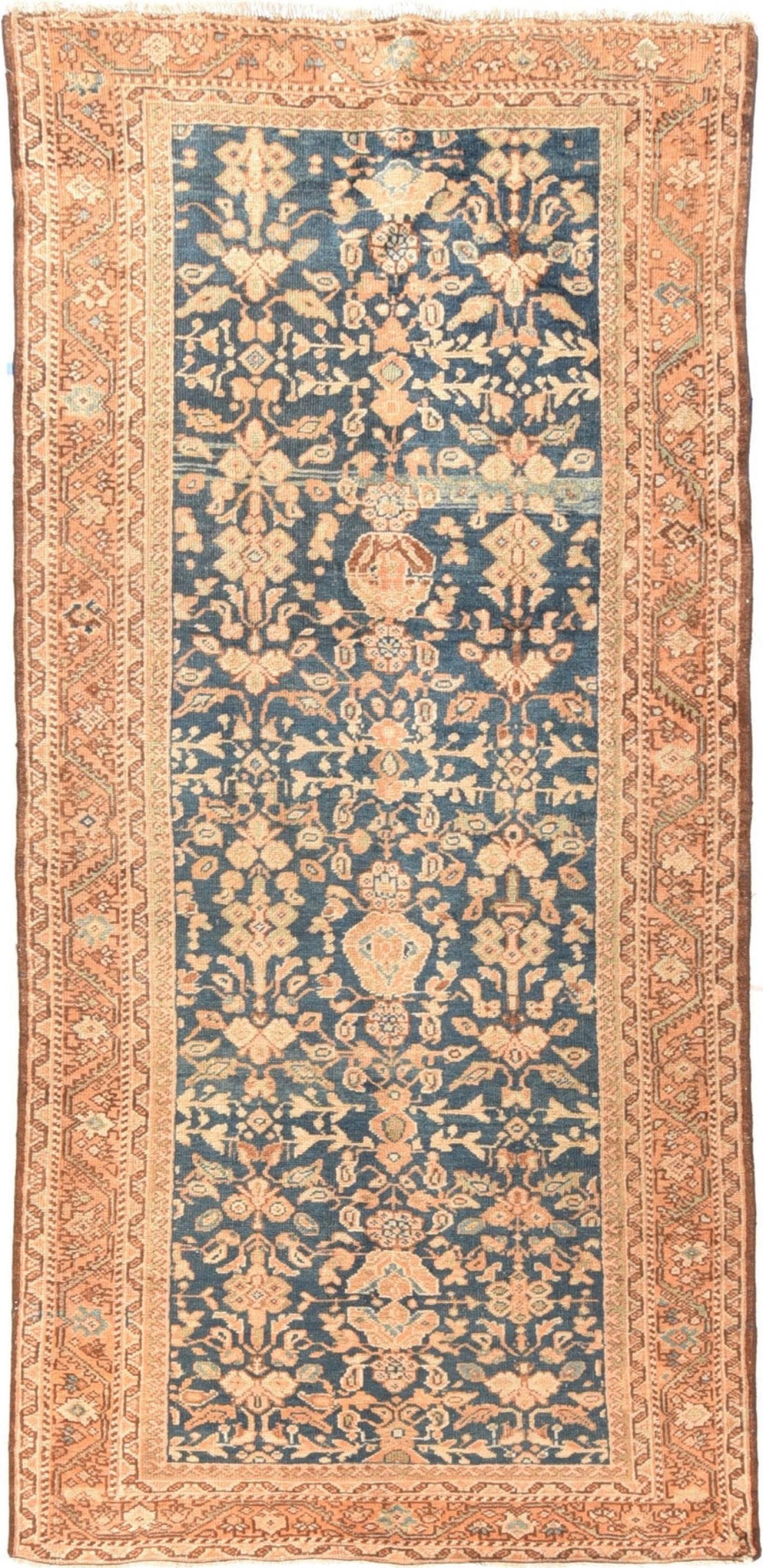 From Western Persia, this Kellegi (long rug) shows an abrashed sapphire ground with an essentially three column allover pattern of petal-winged palmettes, rosettes, horizontal short stems, and botehs and boteh-leaves. Accents in: straw, sand, goldenrod and rose-rust. Burnt salmon border with a serrated leaf meander and bracketed simple palmettes. Mellow tonality. Plain sienna outer border. Cotton foundation. Good condition.
