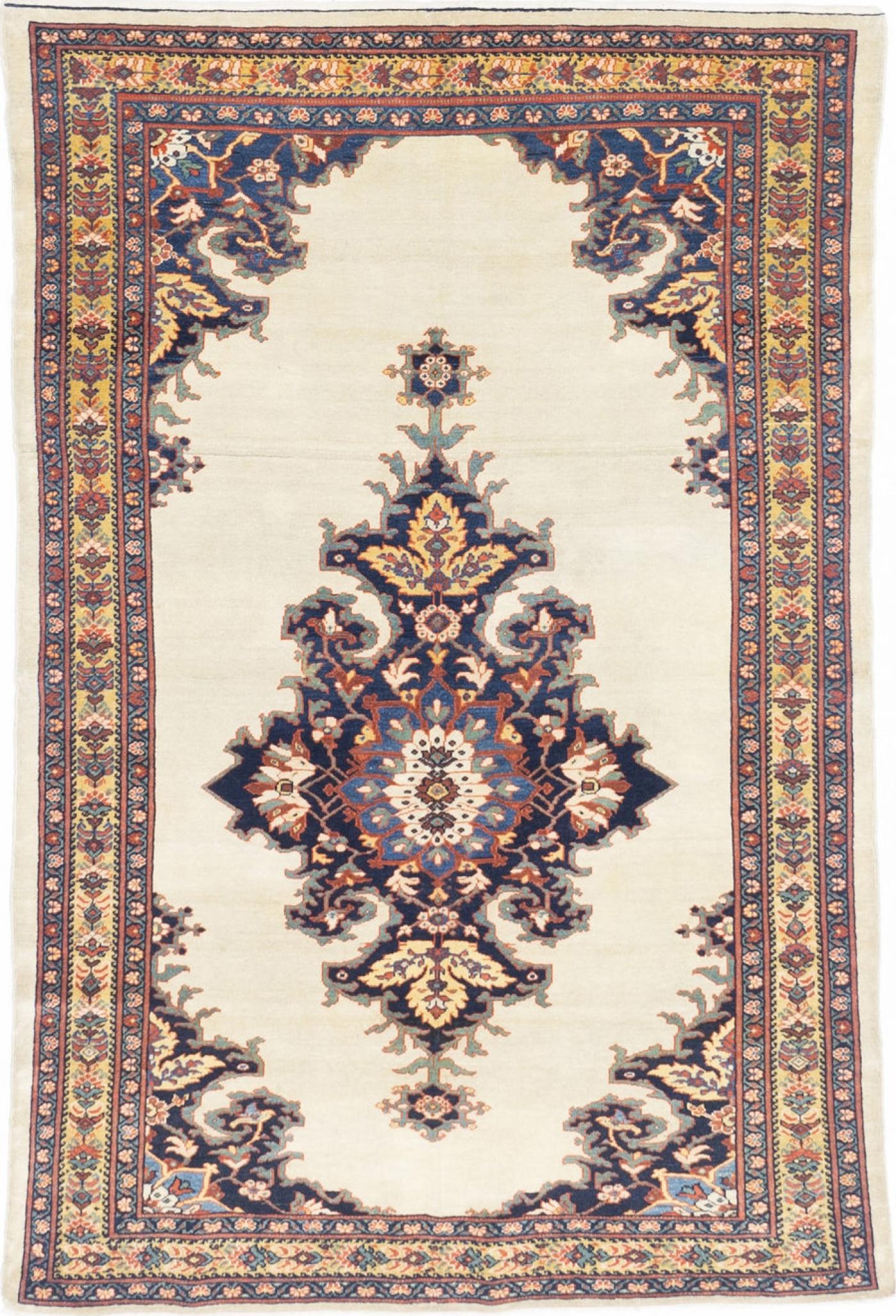 The scatter and room size pieces made in the Arak/Sultanabad area, between 1880 and 1910, with firm and leathery well-woven textures, and strong in red, navy and ecru tones, usually in medallion formats. A transition group between the earlier 19th century Farahans and the post-WWI Sarouks. Drawing is between curvilinear and angular.