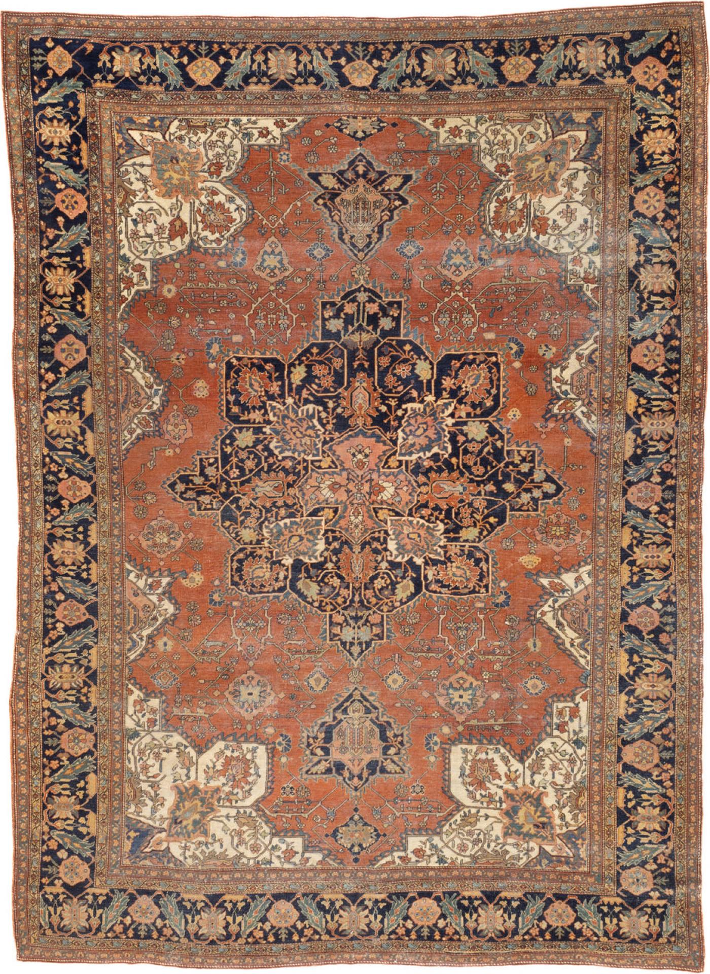 The scatter and room size pieces made in the Arak/Sultanabad area between 1880 and 1910 with firm and leathery well-woven textures and strong in red navy and ecru tones usually in medallion formats. A transition group between the earlier 19th century Farahans and the post-WWI Sarouks. Drawing is between curvilinear and angular.