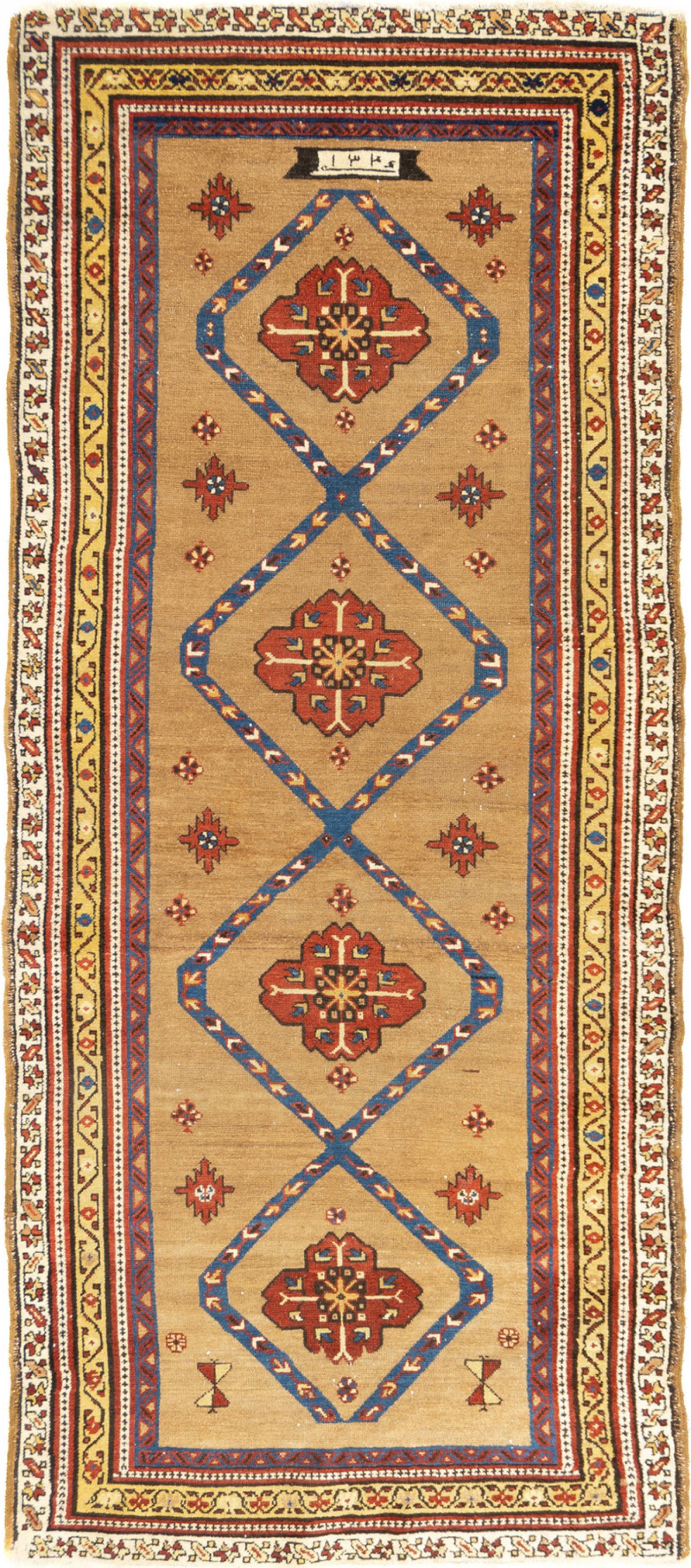From a corner of the NW Persian Heriz triangle, this town and surrounding villages specializes in wool foundation, robustly woven runner (kenares) with important camel tan to brown tones. Very few scatters, gallery carpets and even fewer room sizes. Multiple cartouche field with medallions; geometric drawing. Usually ivory main border. Solid handle.