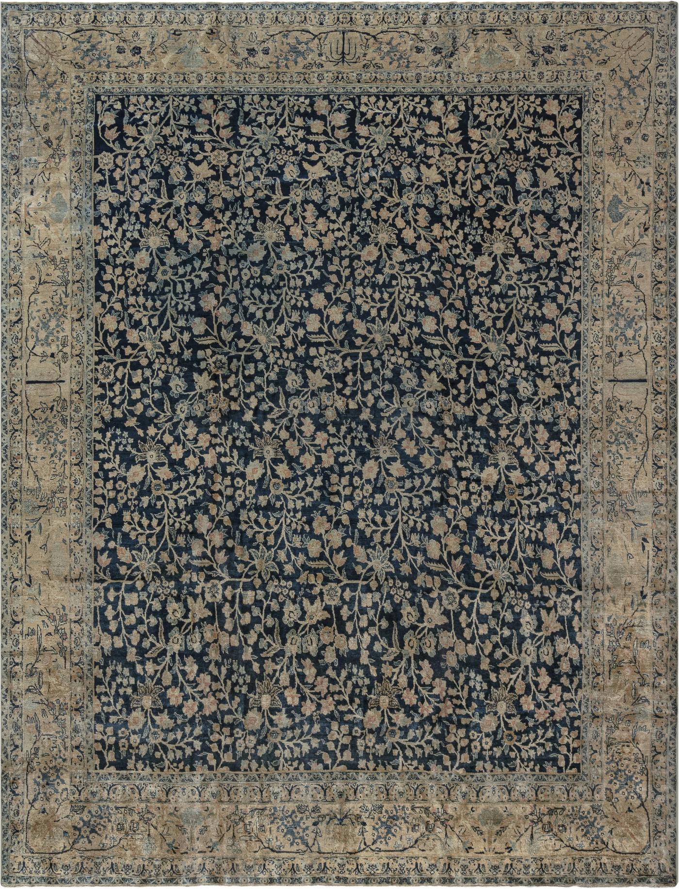 - Antique Persian Kirman Botanic Navy Blue Background Rug (Size Adjusted)