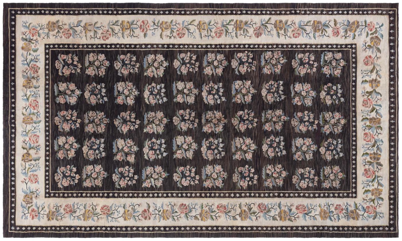 An early 20th century Russian Bessarabian rugs for sale, the striated cocoa field with evenly-arranged bouquets within an oatmeal flowering vinery border.