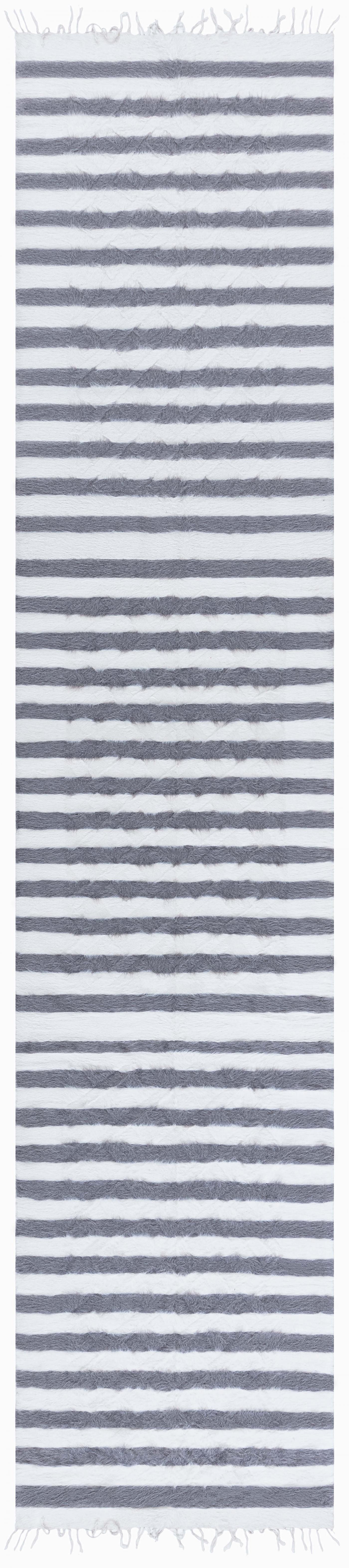 The whole face of this modern runner is covered in gray strips running horizontally across the beige background. Meticulously hand-knotted of top-notch goat hair by a skilled artisan. Thanks to excellent structure and versatile pattern, this modern runner will easily match a wide variety of interior arrangements, bringing in warmth and effortless elegance. Doris Leslie Blau carries an exceptional collection of original modern rugs in many styles and materials. Contemporary hand-made rugs are a bridge throughout history, they are the fruit of the constant evolution of the weaving craft that has accompanied men since the dawn of civilization.