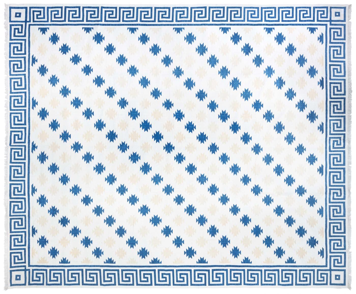 This intricately crafted modern flat-woven cotton rug, known as a Dhurrie, boasts a contemporary aesthetic rooted in traditional Indian floor coverings. Its bold geometric design, framed by a Greek key border in shades of blue and beige on an ivory background, creates an eye-catching composition.
