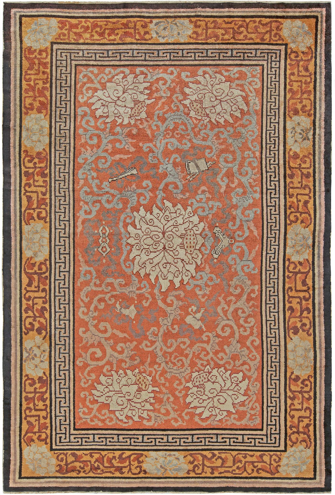 An early 20th Century Chinese silk rugs with a rich orange field with large cream blossoms and intricate vinery in pale shades of cream and grey, surrounded by a color contrasting geometric border and a wide golden border with cream flowers and more vinery. Vintage rugs - they are essential objects of desire of not only vintage trend followers but all aficionados of beauty and sublime design. There is a good reason for such vast recognition as vintage style area rugs constitute the core of taste and artistry of the 20th century progressive thought. They are clearly defined by the past century’s celebration of new ideas, modern lifestyle and the Renaissance of all arts which happened about that time. The category of vintage rugs has many faces – there are numerous aspects such as historical period, style, fashion, culture, symbolism and philosophy which add up to form the dazzling array of vintage antique rugs .