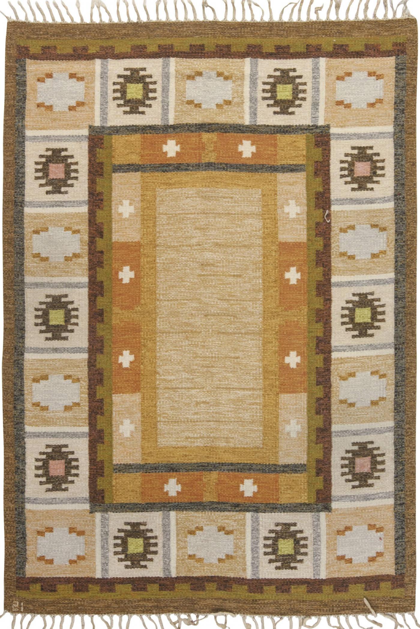 - Vintage Geometric Swedish Beige, Brown, Gold, Green Wool Rug by Ingegerd Silow