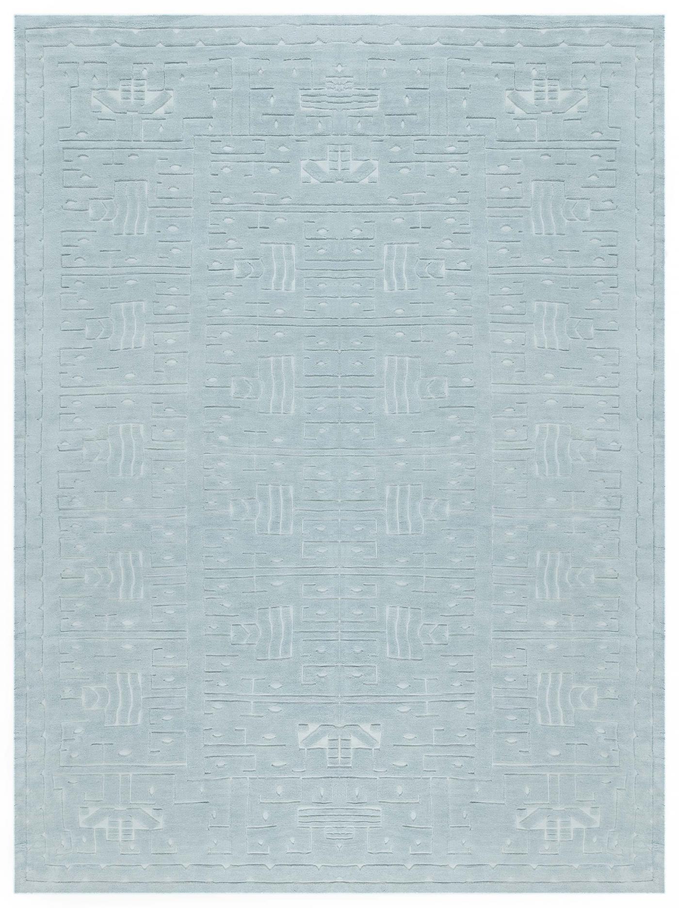 This imposing geometric area rug is the quintessence of the Scandinavian craft in a contemporary edition. The design is inspired by a vintage mid century rug created by Märta Måås-Fjetterström. The high-low knotted Skvattram style rug feature all-over geometric motifs rendered in a soft aqua-blue and beige which creates a balanced contrast. Doris Leslie Blau carries an exceptional collection of modern rugs inspired by mid-century Swedish designs. We stay true to the legendary tradition of Scandinavian craftsmanship by hand-weaving flatweave wool Rölakan rugs and wool pile Rya rugs that are very close in looks and feel to the original ones. Contemporary hand-made rugs are a bridge throughout history, they are the fruit of the constant evolution of the weaving craft that has accompanied men since the dawn of civilization.