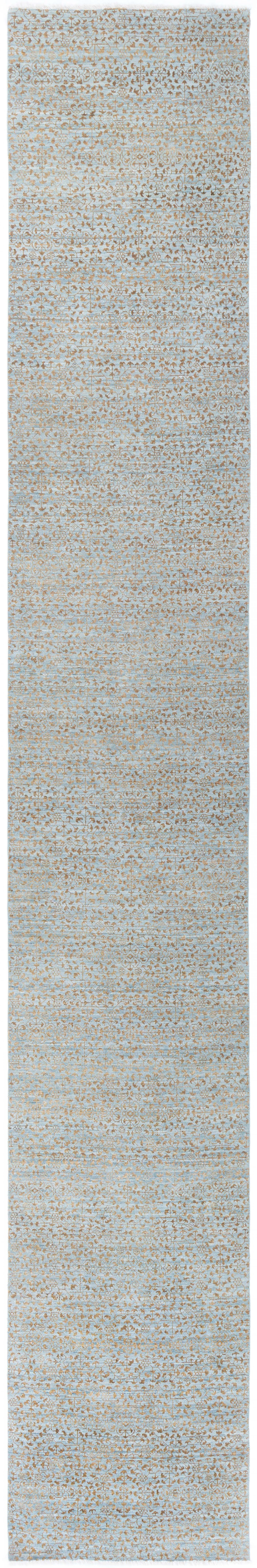 A new, traditional style hand-knotted wool and silk runner made in India, following a centuries old technique. This is a timeless runner with an allover dense and delicate pattern of floral and angular vines. The color palette consists of blue, gray and gold. Doris Leslie Blau carries an exceptional collection of original modern rugs in many styles and materials. Contemporary hand-made rugs are a bridge throughout history, they are the fruit of the constant evolution of the weaving craft that has accompanied men since the dawn of civilization.