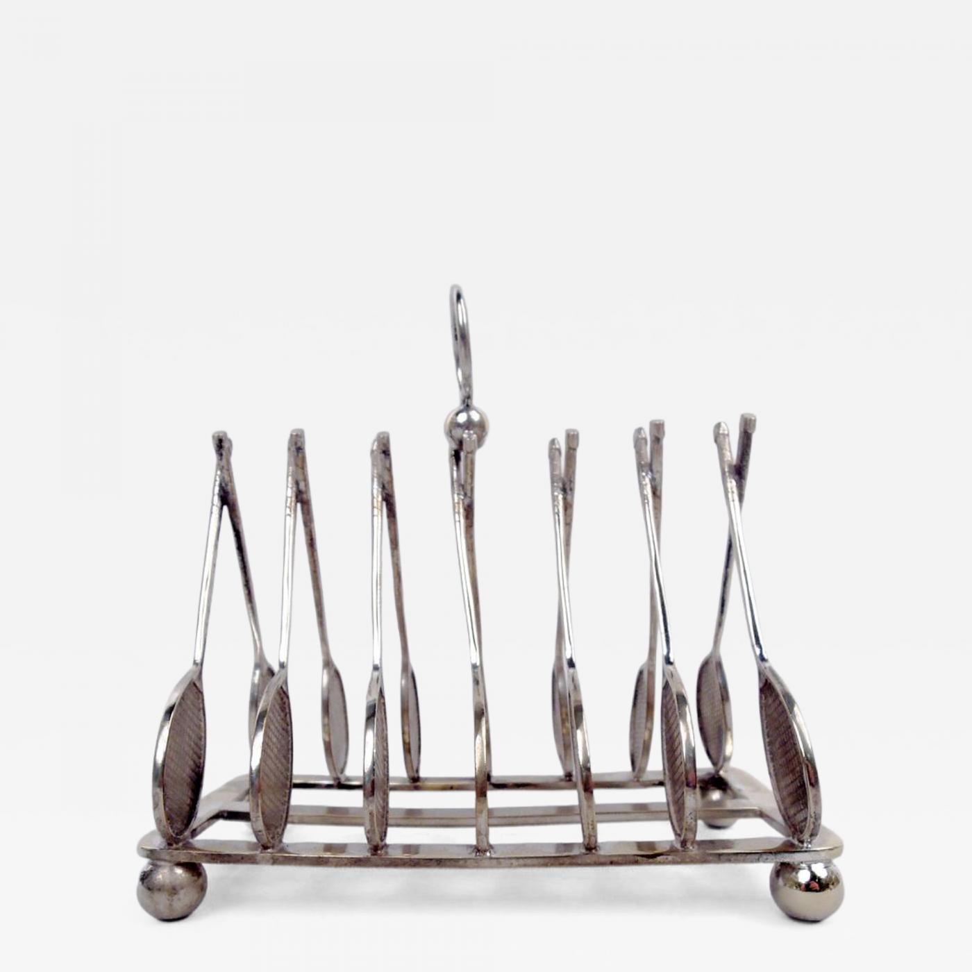 Antique English Art Deco Silverplate Novelty Tennis Racket Toast RackCC749English Art Deco silverplate novelty toast rack, ca 1920. Seven pairs of tennis rackets, handles crisscrossing and heads mounted to rectilinear frame with central stretcher and curved corners on ball supports; ring handle. Holds six slices. Maker’s stamp. Very good condition.Dimensions: H 6 3/4 x L 6 3/8 x W 3 1/2 in. #CC749