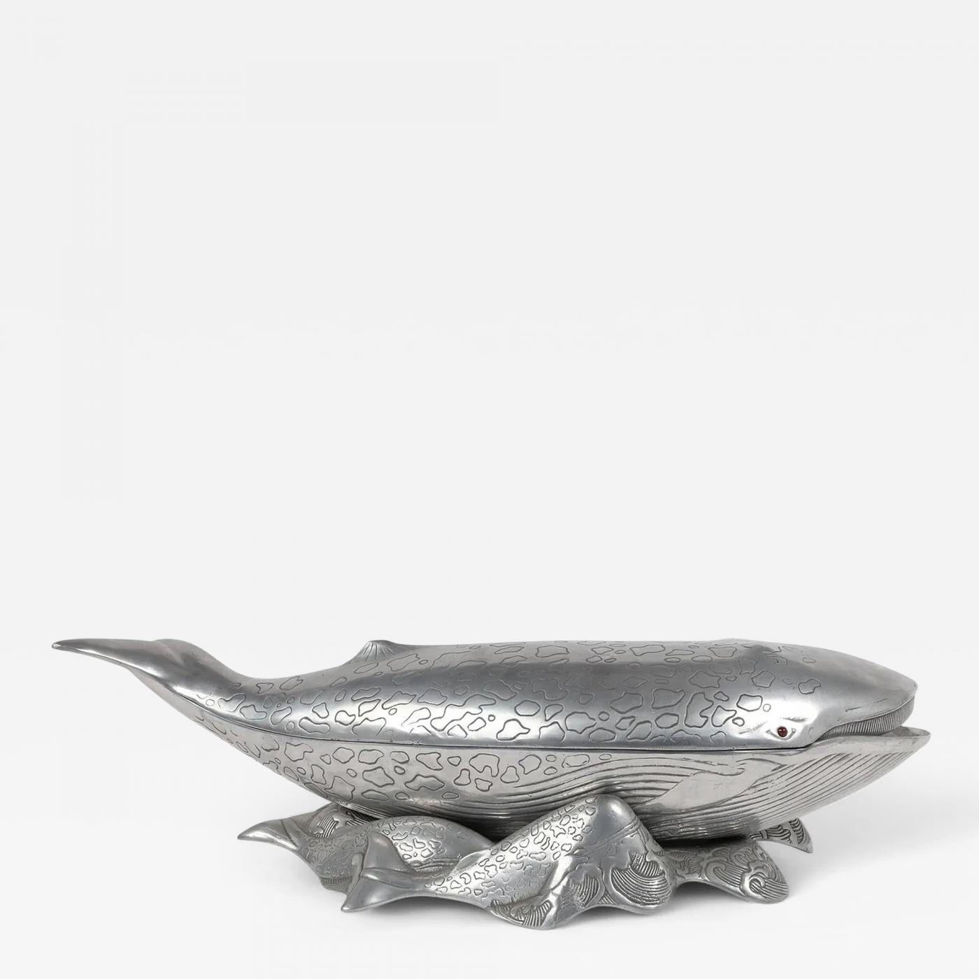 fitted with red cabochon eyes, the vintage Arthur Court aluminum whale-shaped ice bucket, wine cooler or tureen comprised of a base and cover; all resting on a matching stand consisting of swimming calves; stamped to underside;