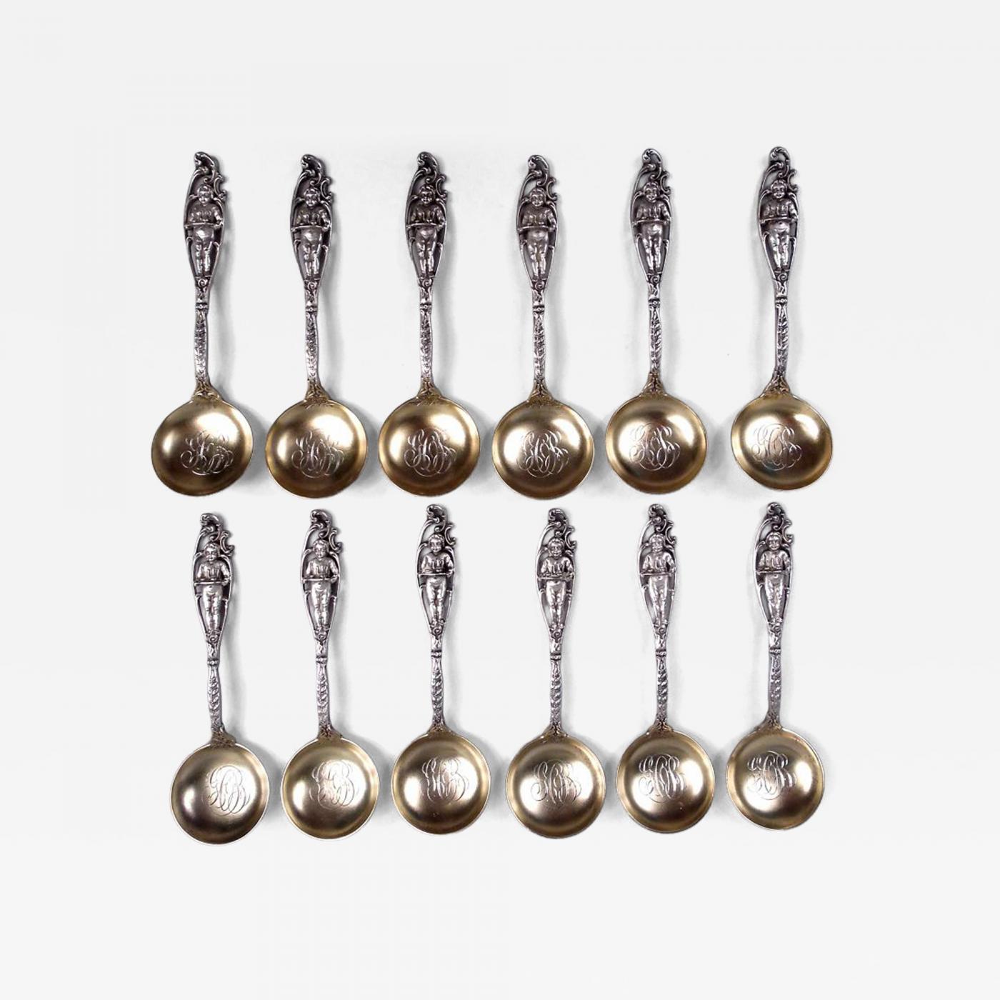 Set of 12 Labors of Cupid sterling silver five o’clock spoons. Made by Dominick & Haff in New York, ca 1900. Early pieces in the pattern that immortalizes the infantine travails of a bare-bottomed cherub in double-sided scrolled terminal. In this case, carrying the coffee tray. Stem decorated with fruiting berry branch; bowl round and gilt with engraved interlaced script monogram. Fully marked including maker’s stamp. Very good condition.
