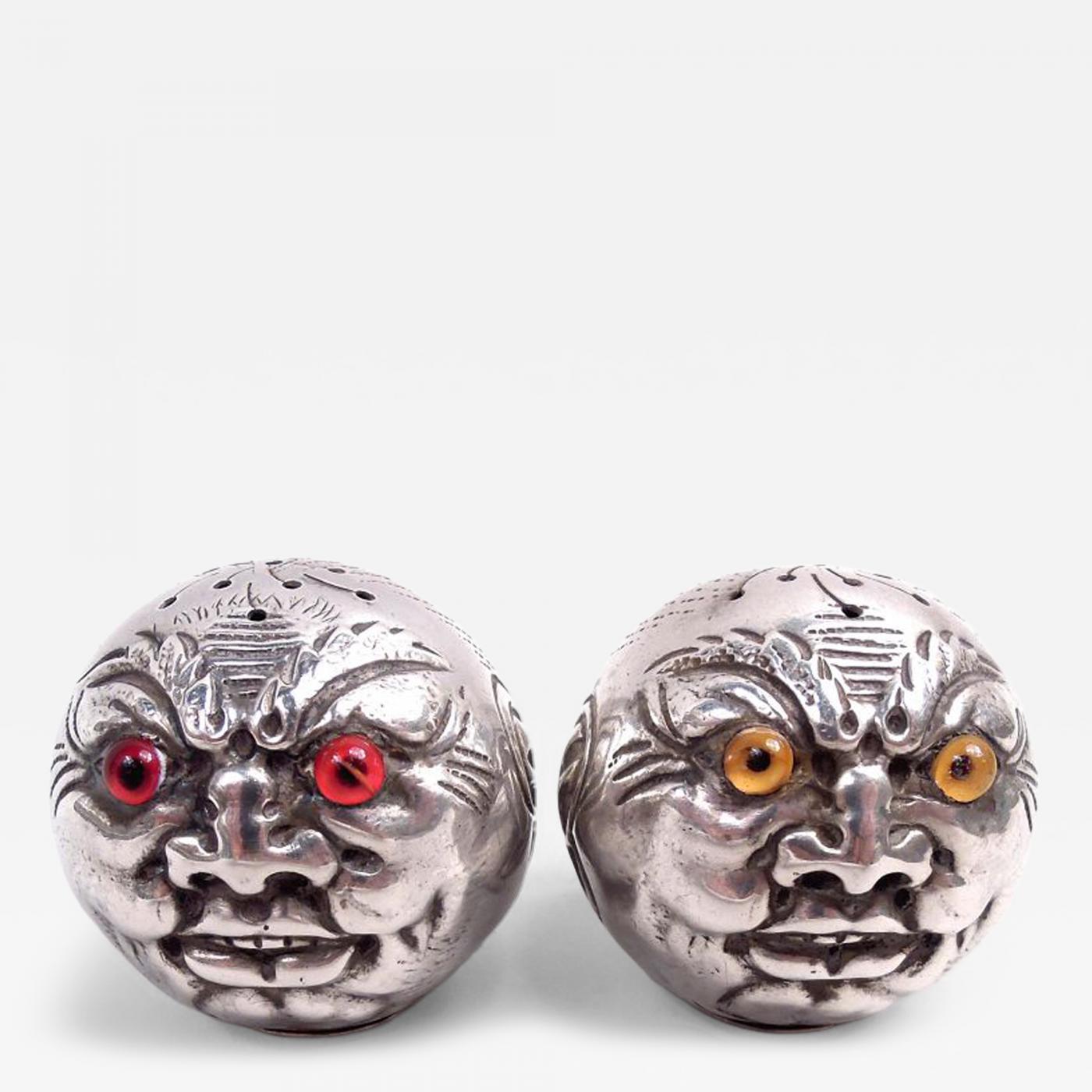 Pair of Victorian novelty sterling silver salt and pepper shakers. Made by Gorham in Providence in 1881. Ball form in form of male head. The so-called Man in the Moon represented as a jowly middle-aged earthling. Furrowed brows and bulging glass bead eyes suggest a choleric temperament. Hollow with hinged bottom. Fully marked including maker’s stamp, date letter, and no. 1680. Very good condition. Damage to one eye. Possibly a scratched cornea.