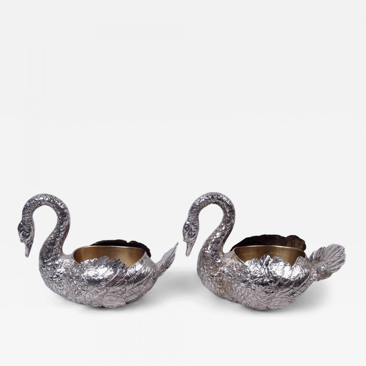 Pair of Antique German Hanau Silver Swan BowlsCC735Pair of German 800 silver figural bird bowls, ca 1910. Each: Swan with ovoid body, s-scroll neck terminating in closed bill, upturned tail, and hinged plumy wings. Well has detachable brass liner. An elegant dinner party twosome. Marks include Hanau maker’s stamp. Very good condition.Dimensions: H 7 x L 9 3/4 x W 5 in. Wingspan: H 11 in. Total weight (without liner): 35.7 troy ounces. #CC735