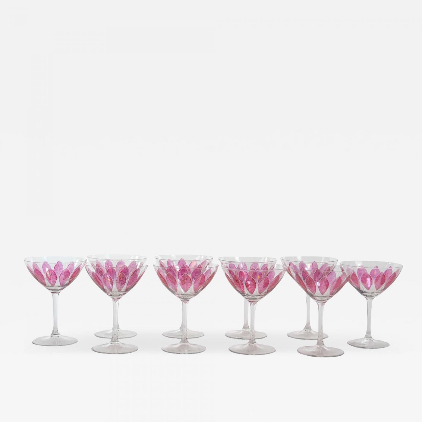 Beautifully hand painted and slightly gilt with exterior leaf design details barware / tableware champagne coupe service for ten people. Each glass is in great condition. Each one measures 5.5 inches high and 4 inches diameter.