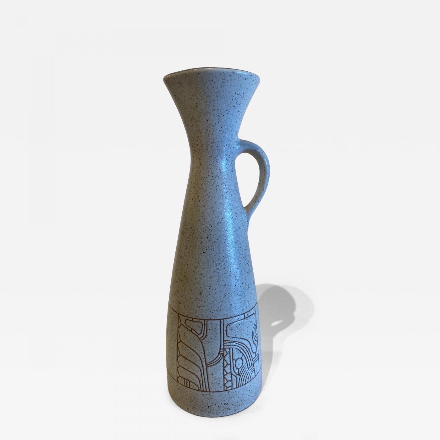 Depth: 3.5" || Israeli Mid-Century Lapid Sgraffito Glazed Ceramic Narrow Pitcher with a flaired top and handle (companion pieces REG4743A-M)