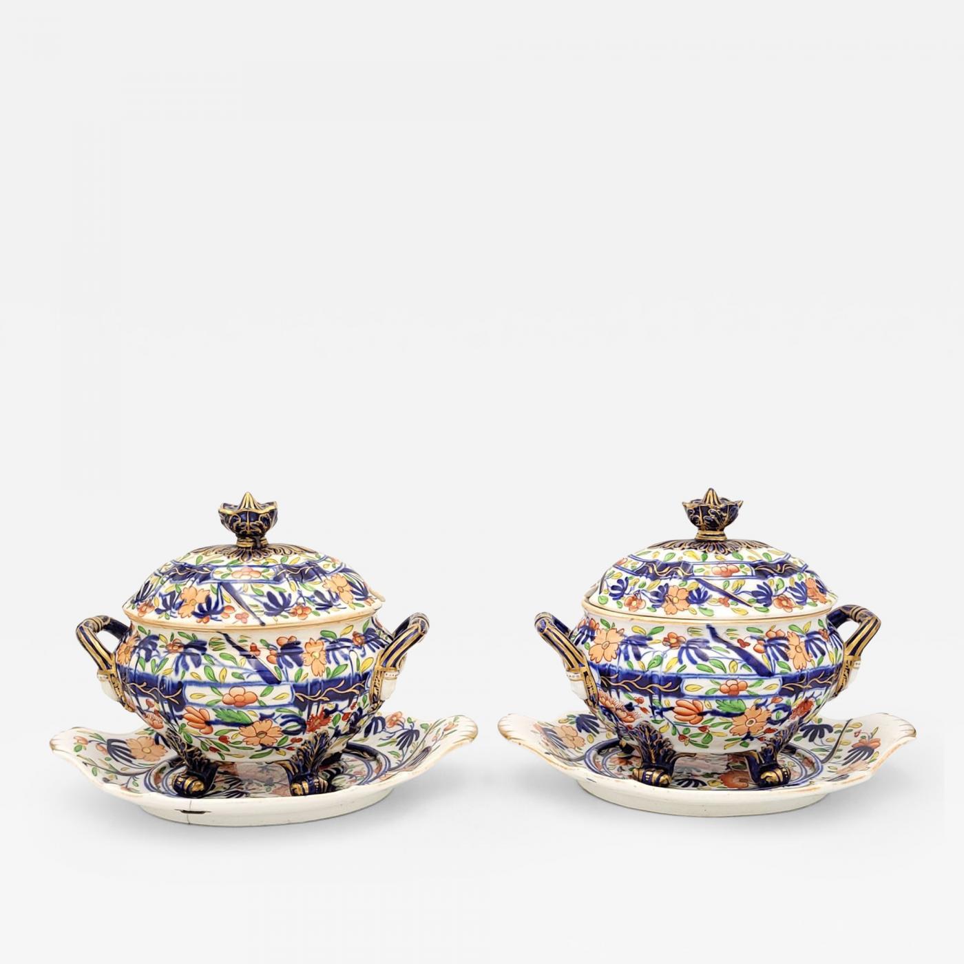 A pair of Coalport sauce tureens, England circa 1825. One of the turneens and under plate have been restored with staples restored .