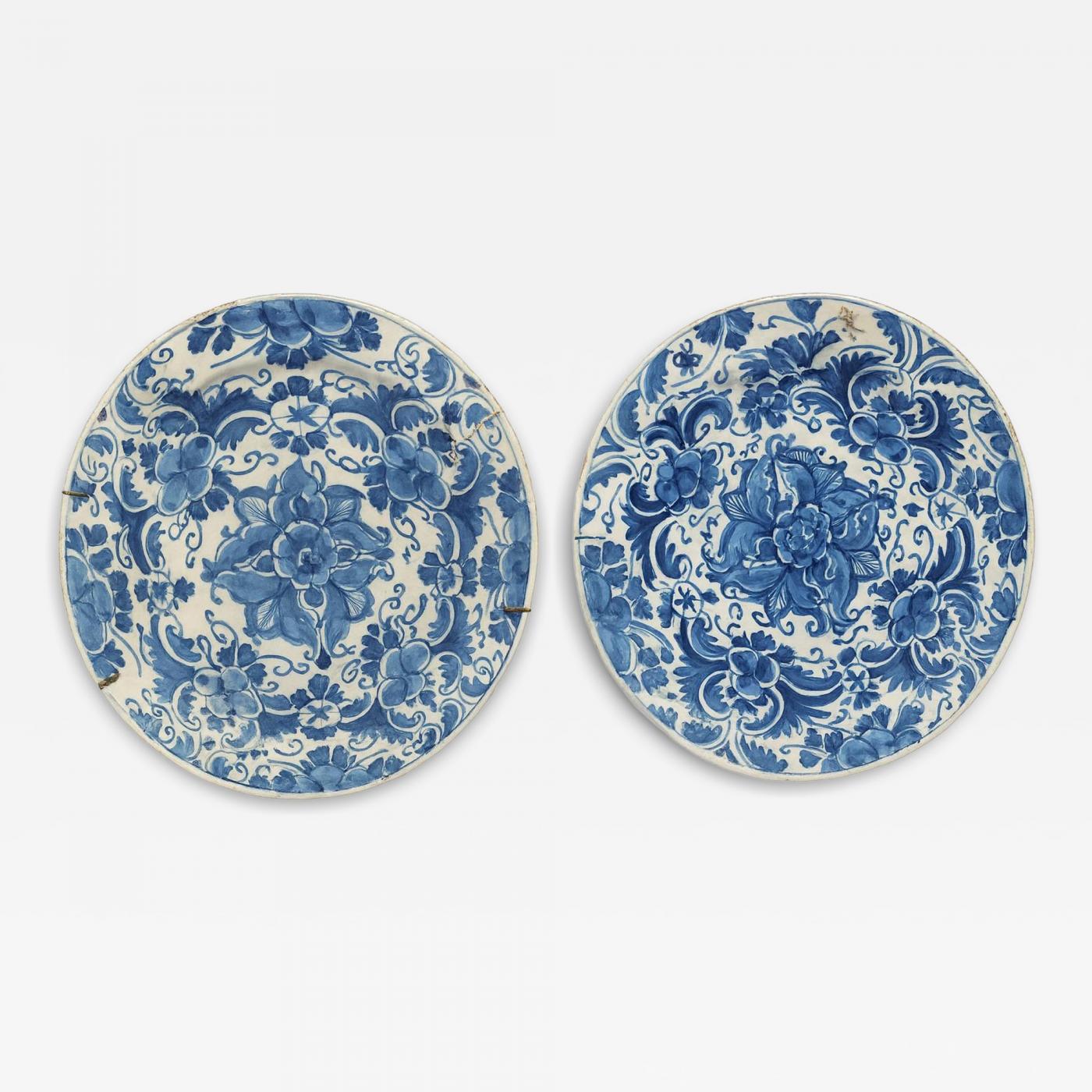 A pair of dark blue delft plates densely decorated with a swirling kaleidoscope of flowers and leaves from the centers to the edges. Known as de Grieksche "A" (Greek "A") pattern. Rare to find a pair. Dutch, circa 1770.