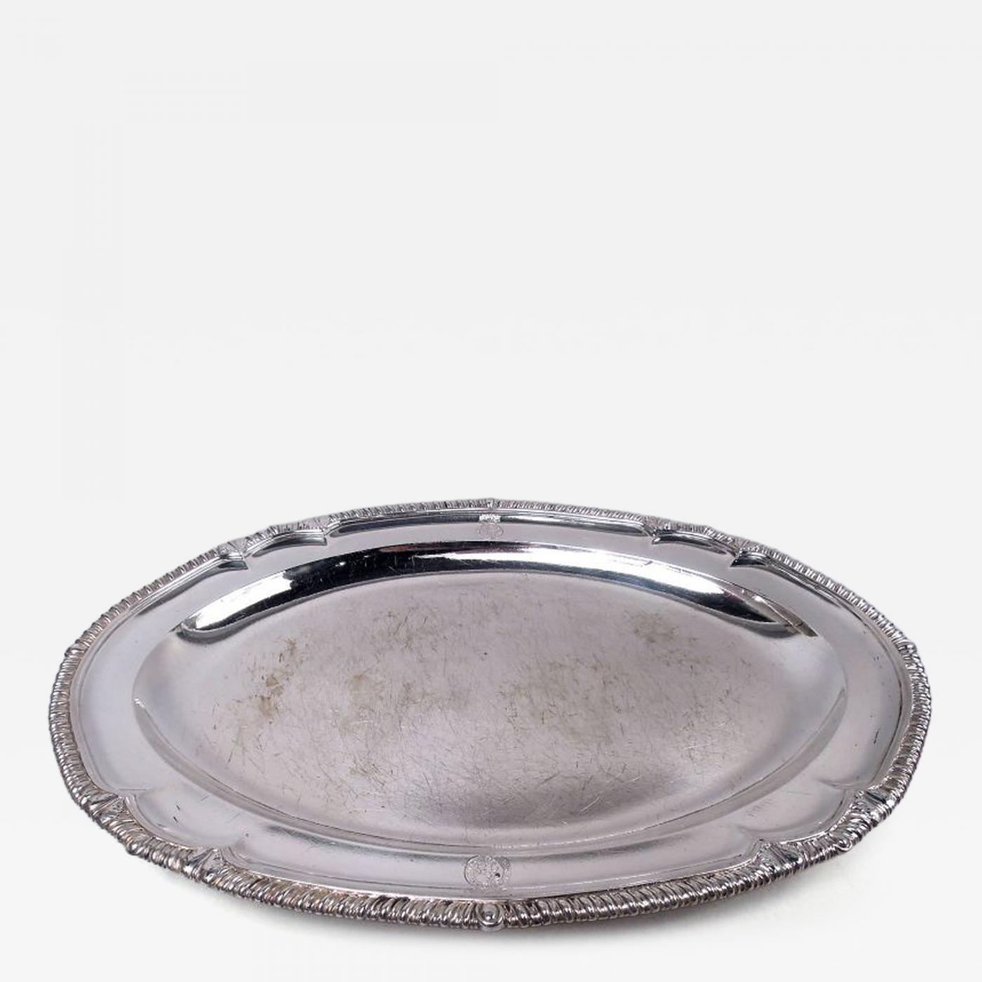 George III sterling silver tray. Made by Paul Storr in London in 1810. Oval well, serpentine shoulder, and gadrooned rim interspersed with leaves.