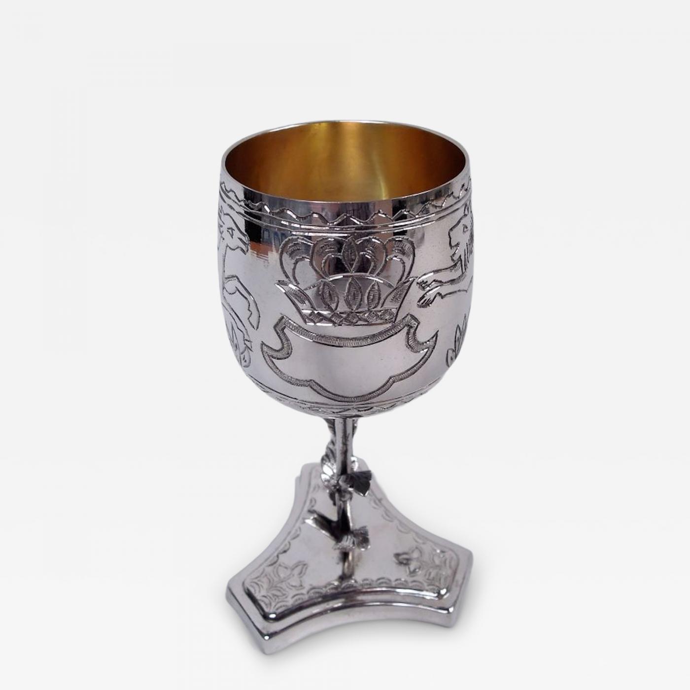 Regal sterling silver goblet, ca 1960. Curved and upward tapering bowl with chased armorial surmounted by crown and flanked by deer and lion; lined and wavy borders. Leafing stem mounted to truncated and concave tripartite foot with flowers and scalloped border. Bowl interior gilt. Marked. Very good condition.