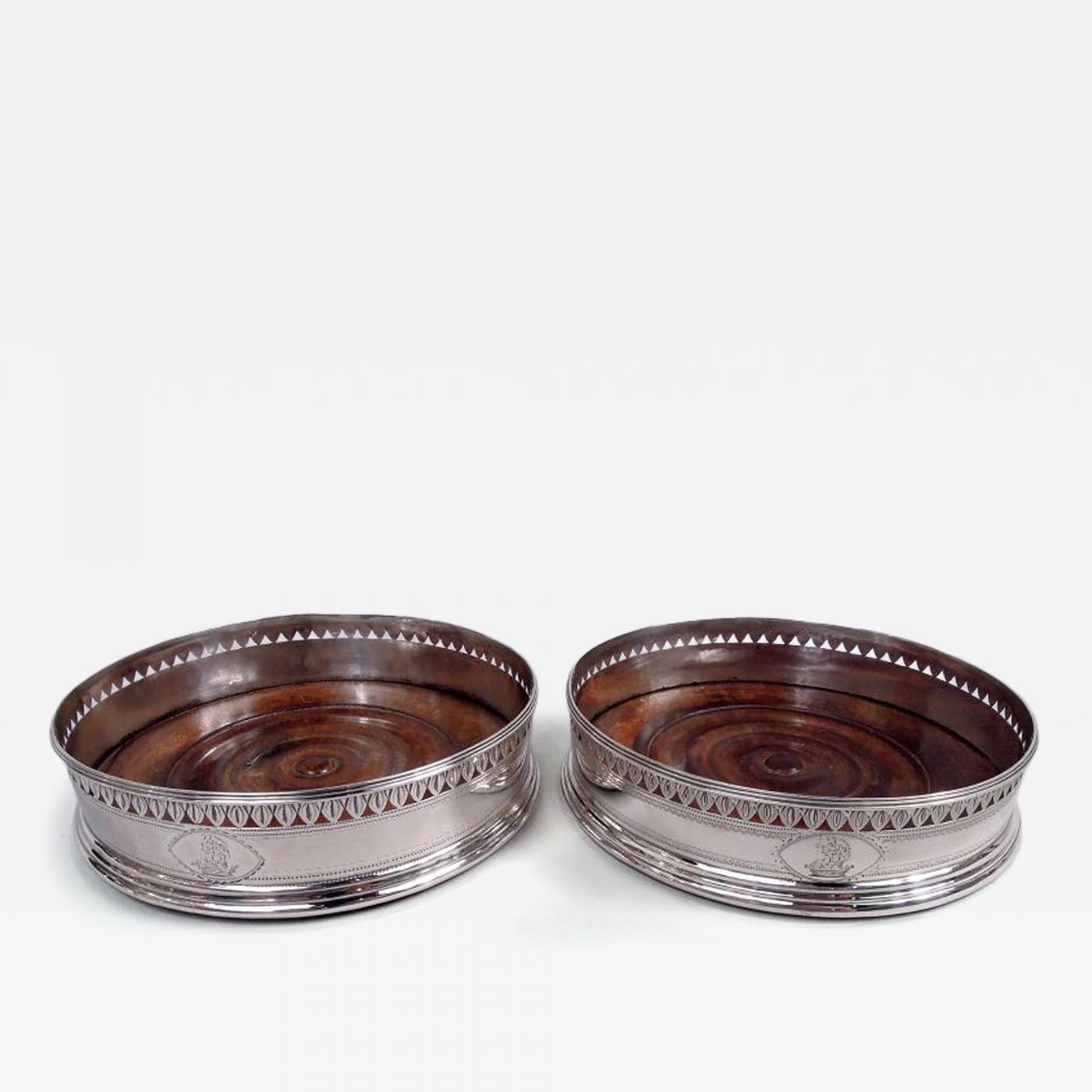 Pair of George III sterling silver wine bottle coasters. Made by Robert Hennell in London in 1792. Each: Straight sides with reeded rim and stepped base. Pierced and bright-cut egg-and-dart, pointille, and wavy borders; lion armorial. Stained-wood well with concentric rings. Fully marked. Very good condition.