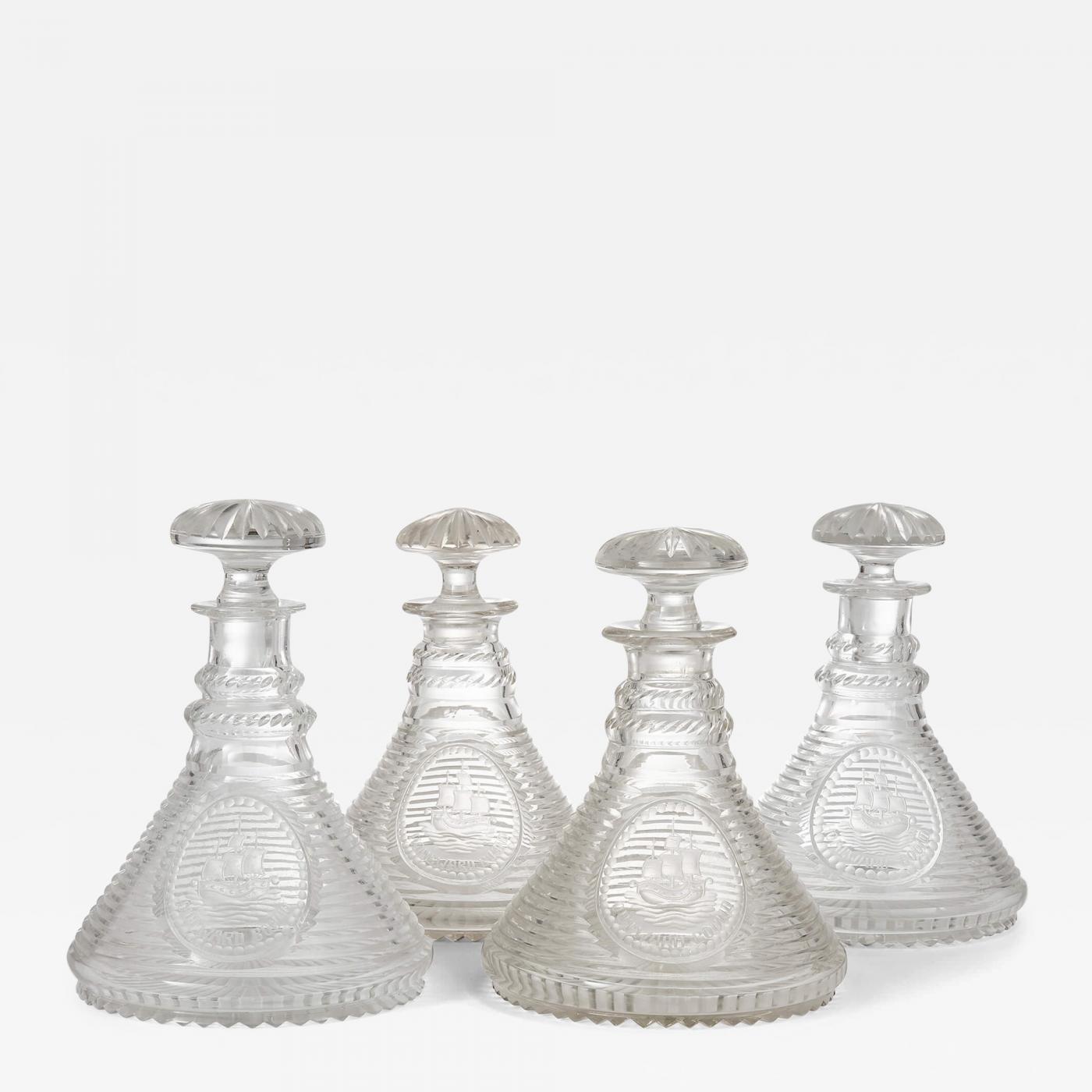 In a set of two closely matching pairs, these charming glass decanters are wonderful antique pieces with which to store and serve spirits and liqueurs, having been crafted in the early part of the twentieth century in England. Two of them are engraved 'Outward Bound' and show galleon-like ships travelling in one direction, while the other two are engraved 'Homeward Bound' and depict ships travelling in the other. They feature a ribbed pyramidal design with concentric circles, a ridged base, and virtually identical stoppers. The pieces differ slightly in terms of the lengths of the necks, which in fact only adds to the charming, quaint, and quirky nature of these fine antique pieces, the ideal items with which to serve spirits. -