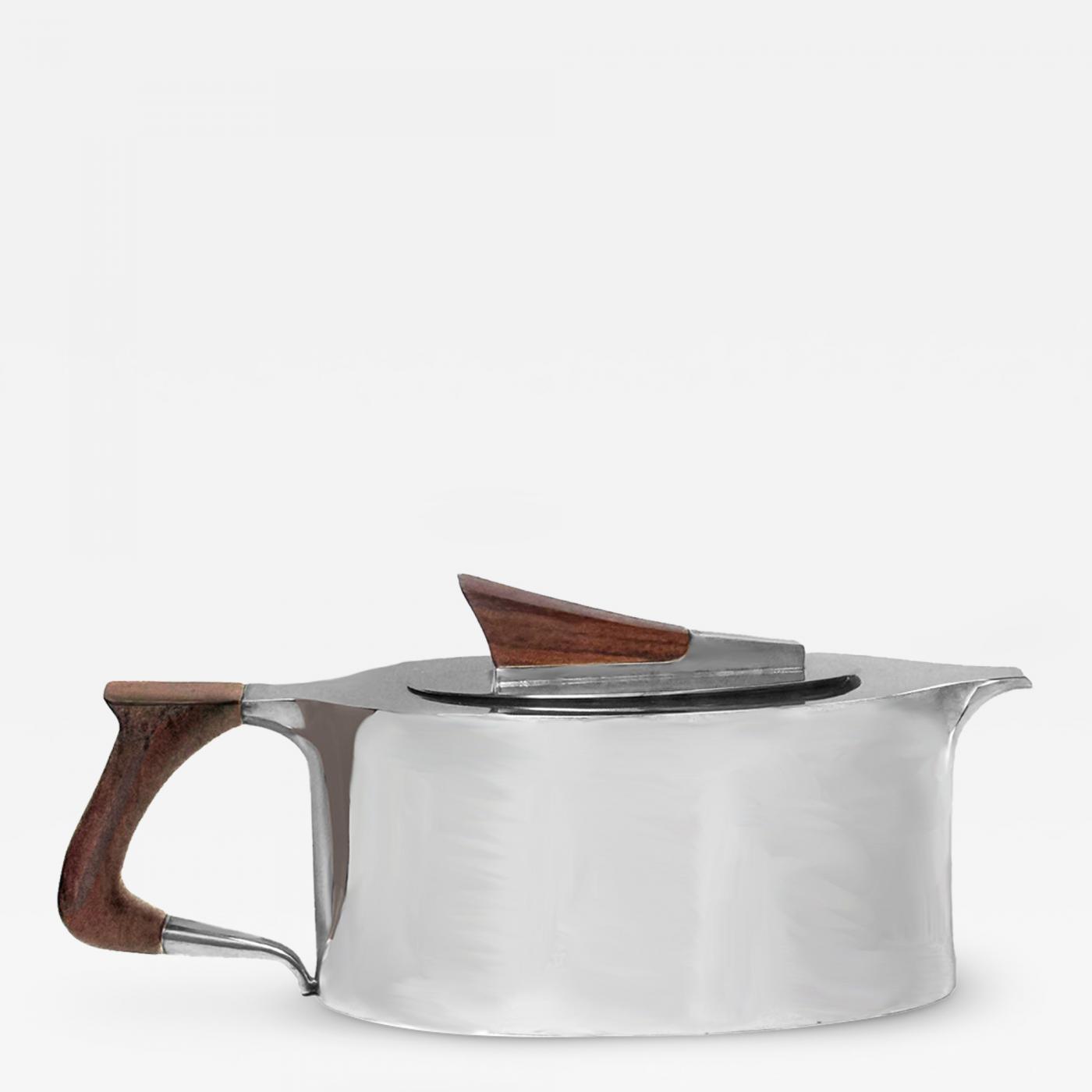 This great teapot was hand forged. The handles are rosewood. It has a great organic modernist design and good weight.