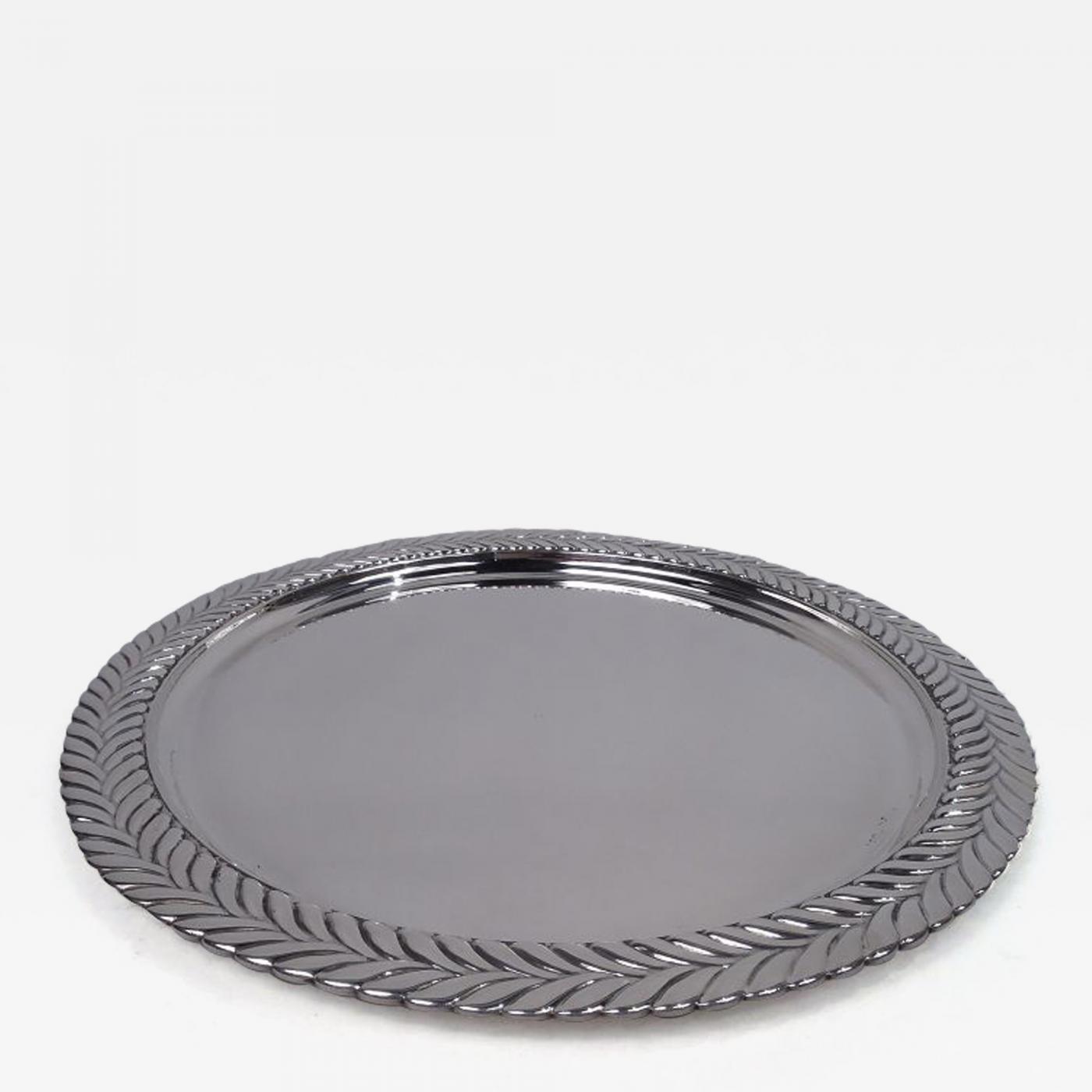 Stylish Victorian sterling silver tray. Made by Tiffany & Co. in New York. Round and plain well. Wide rim with low-relief border in form of imbricated leaves or chevrons. A popular motif that is sometimes known as Wave Edge. Fully marked including maker’s stamp, pattern no. 5766, and director’s letter C (1902-07). Very good condition.