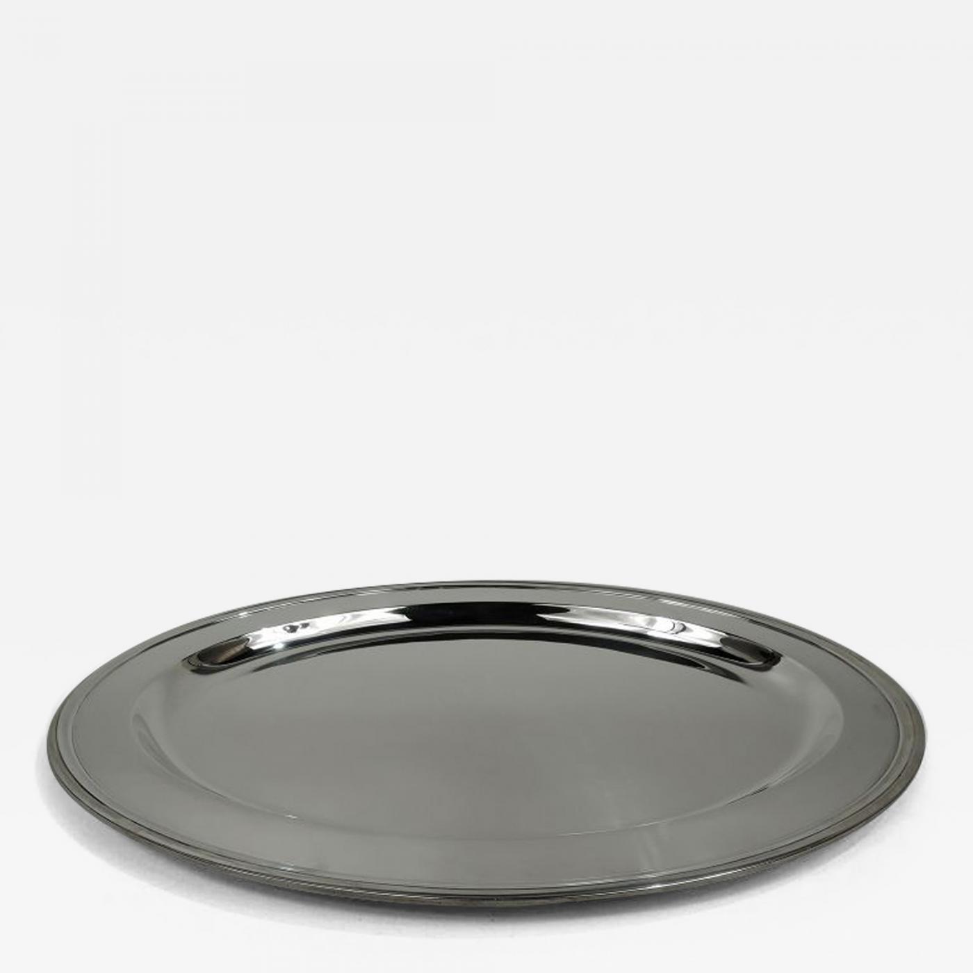 Large and Modern sterling silver serving tray. Made by Tiffany & Co. in New York, ca 1923. Oval with deep well, wide shoulder, and molded rim. Fully marked including maker’s stamp, pattern no. 20182 (first produced in 1923), and director’s letter m. Very good condition.
