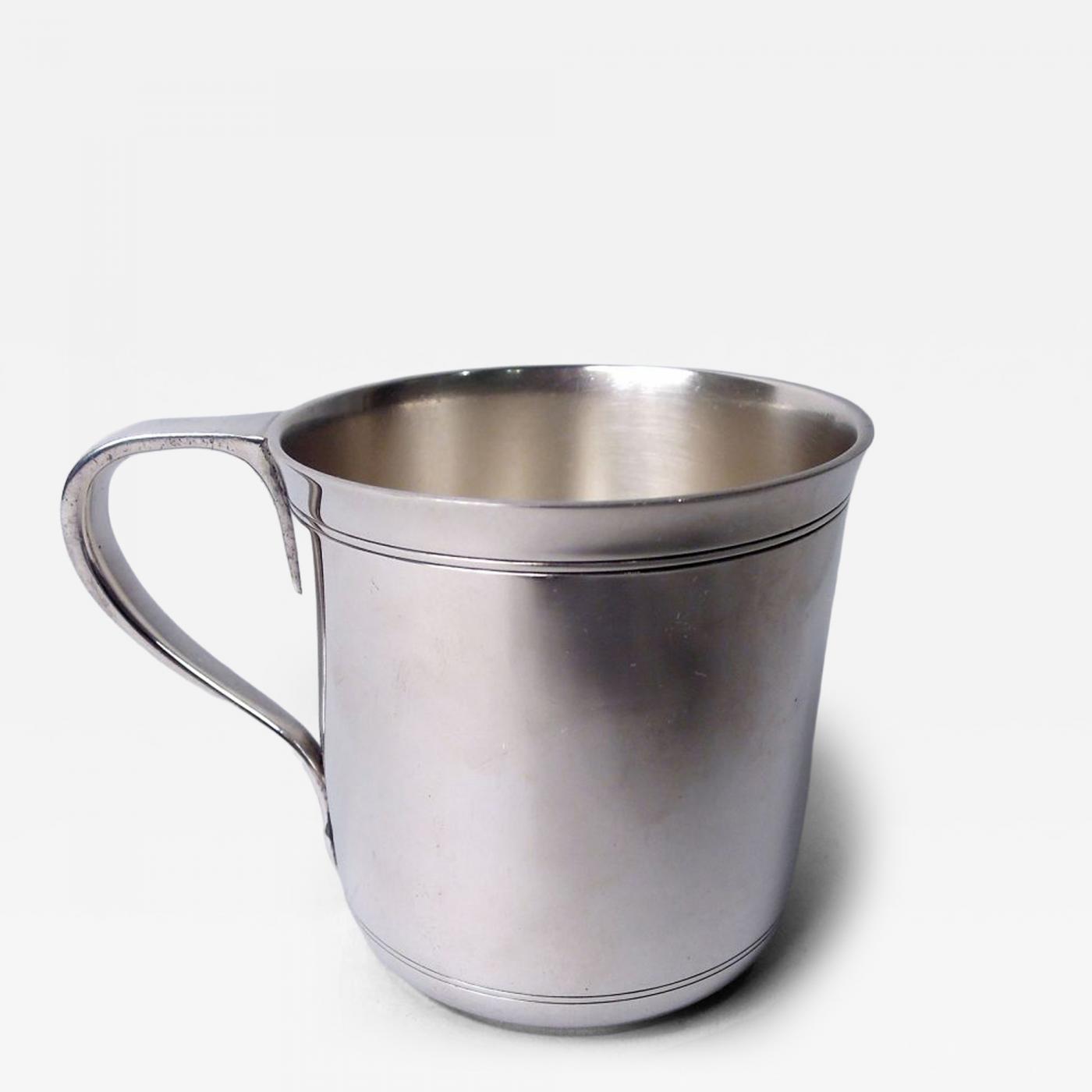 Modern sterling silver baby cup. Made by Tiffany & Co. in New York, ca 1923. Flared mouth rim and scroll bracket handle; chased double bands at mouth and base. Plenty of room for engraving. Fully marked including maker’s stamp and pattern no. 20273 (first produced in 1923), and director’s letter m. Very good condition.
