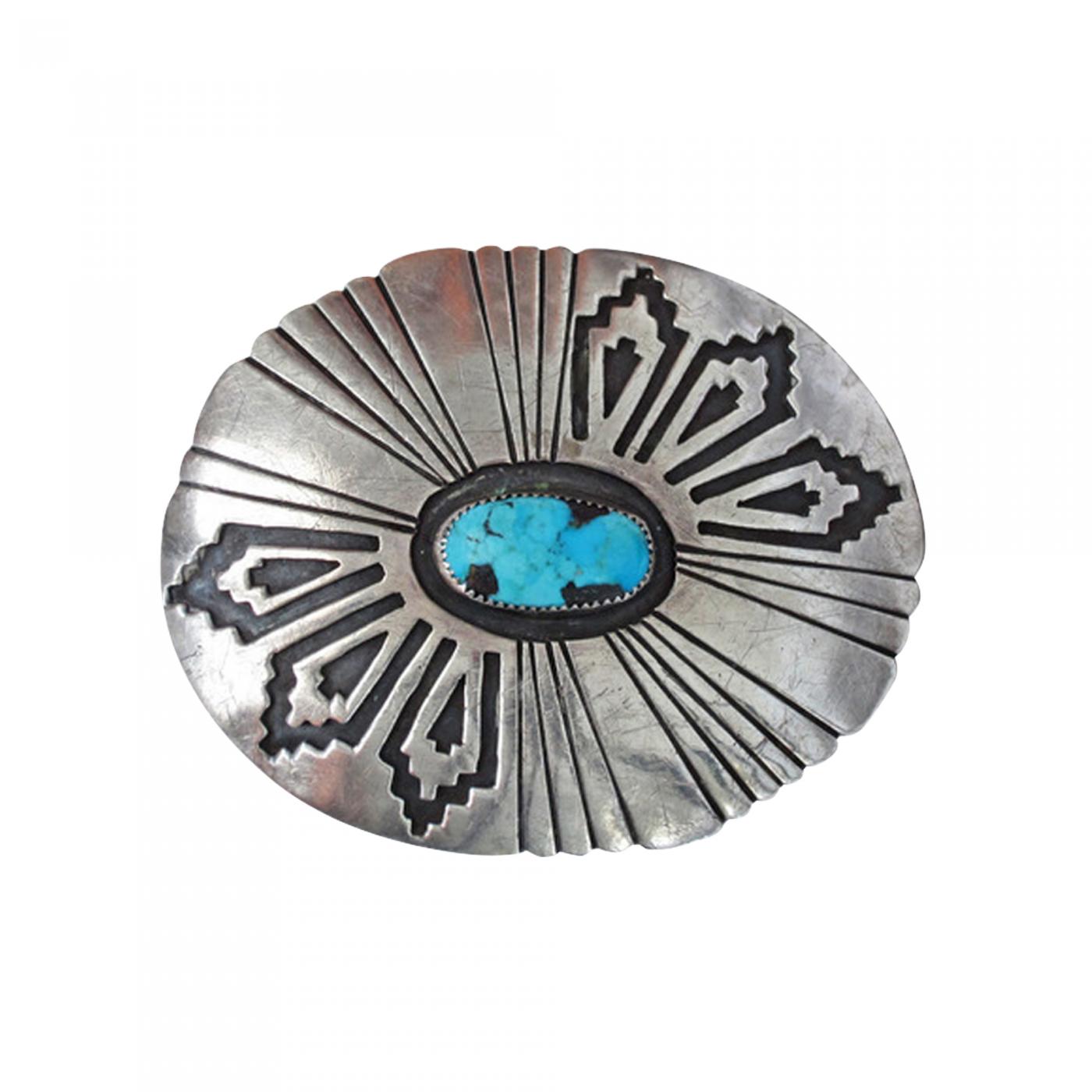 The silver overlay technique was developed by the Hopi in 1949. In it, the silversmith joins two pieces of silver, which produces a clear depth in the design. This technique was used very effectively by the Hopi silversmith who made this belt buckle. With an asymmetric design of sun's rays reflecting across the mesas (or perhaps church??), a strong message of well-being and joy are conveyed.
