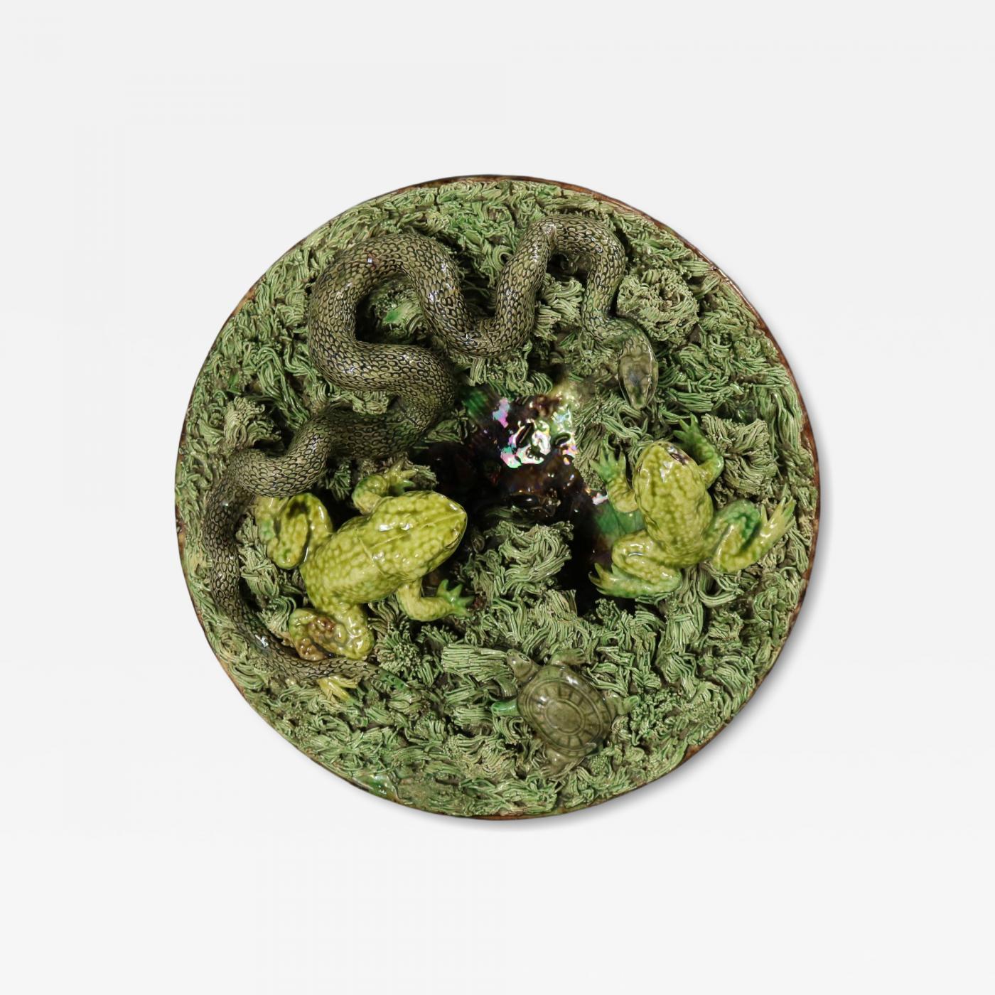 Augusto Baptista de Carvalho Portuguese Palissy Majolica wall plate which features a snake, two frogs and a tortoise, surrounding a central well. Colouration: green, grey, brown, are predominant. The piece bears maker's marks for the Augusto Baptista de Carvalho pottery. Bears a pattern number, '6'.