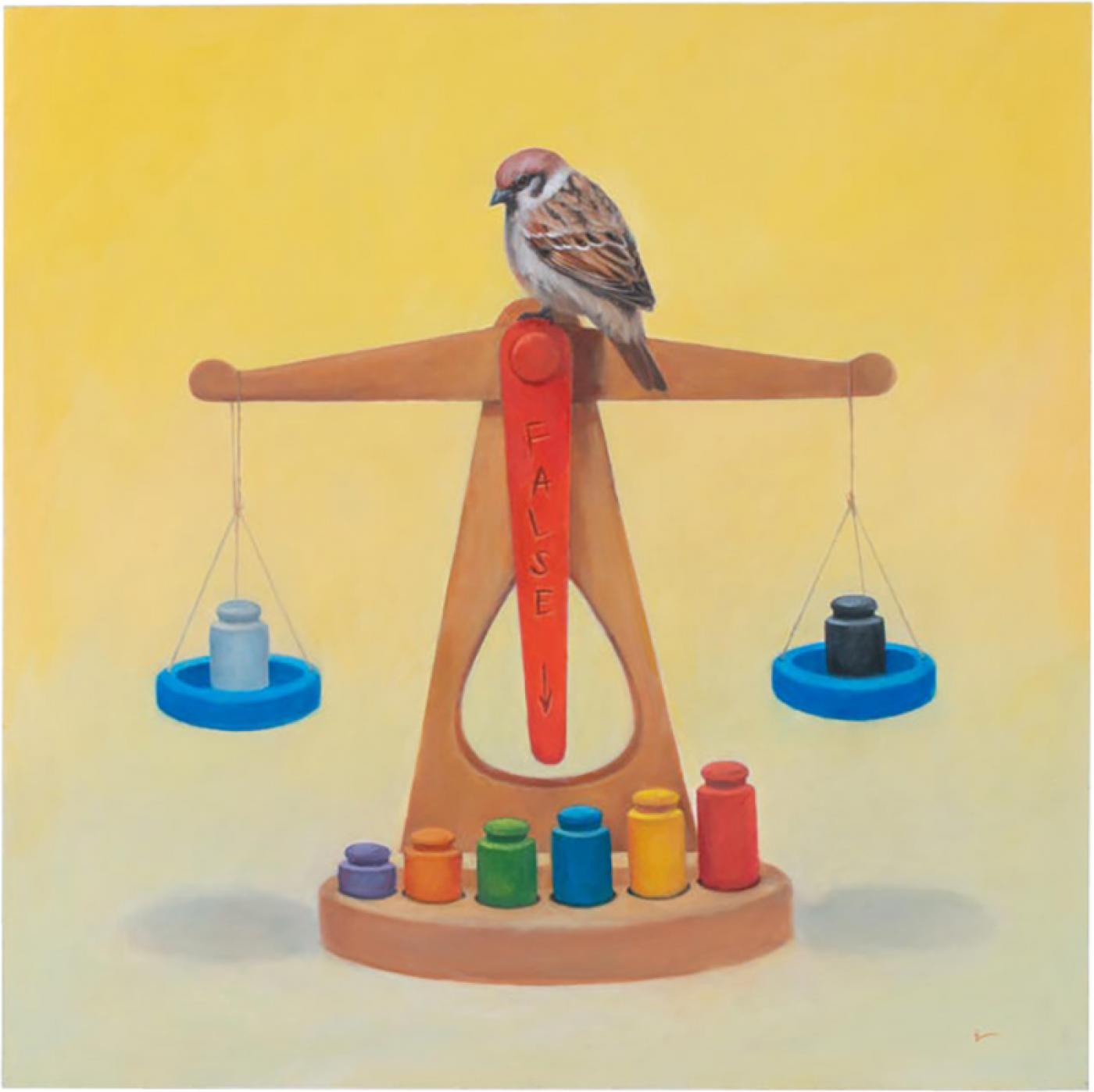 Wieringa’s playful paintings are richly painted and detailed. Birds rest delightfully on children’s toys, but when coupled with the titles, reveal a tongue-in-cheek and deeper meaning.