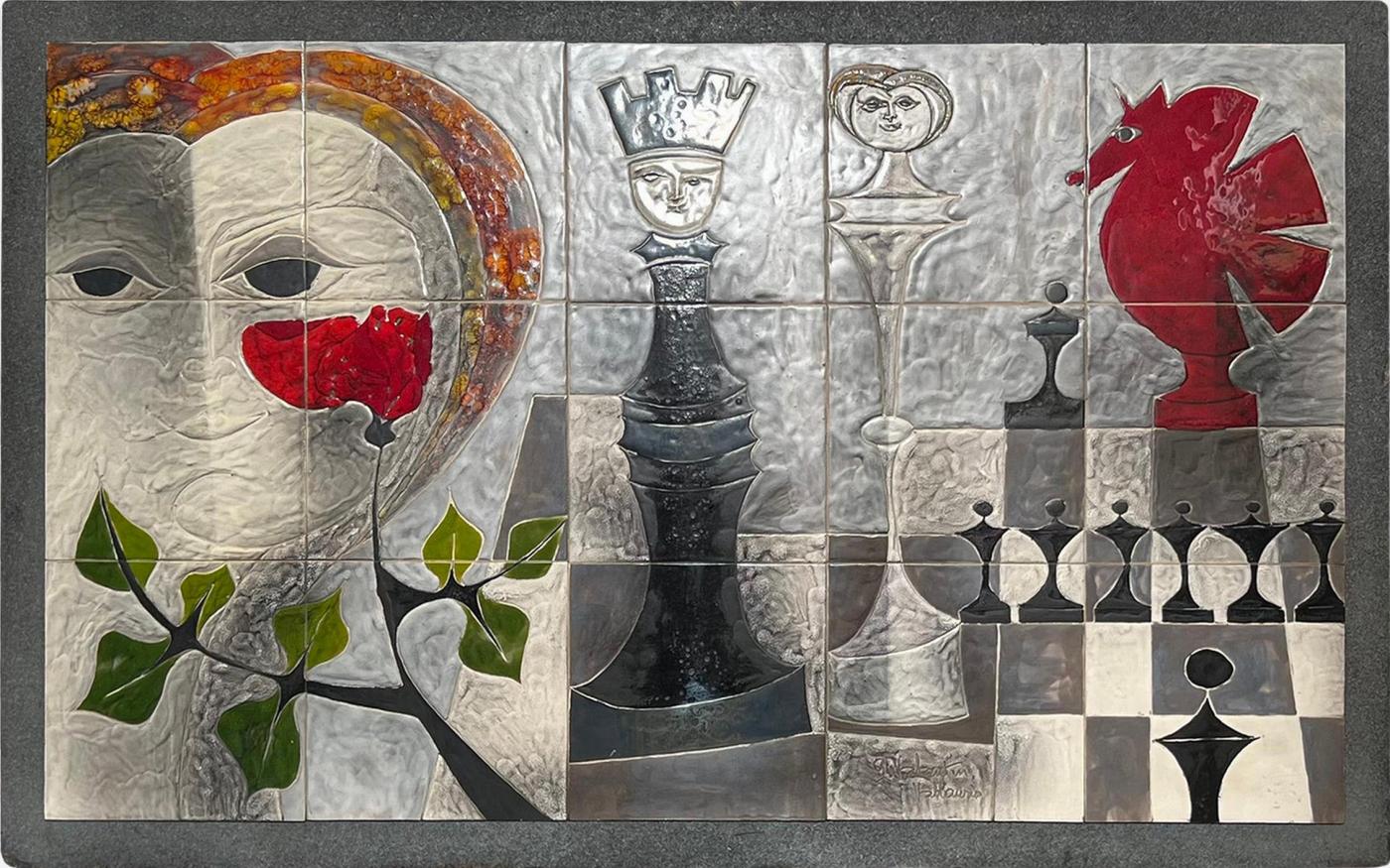 Large decorative panel made of glazed ceramic tiles: a dreamlike design in muted gray tones illuminated by red, yellow, and orange, combining chess pieces, delicate heart-shaped faces, and a long scarlet rose.