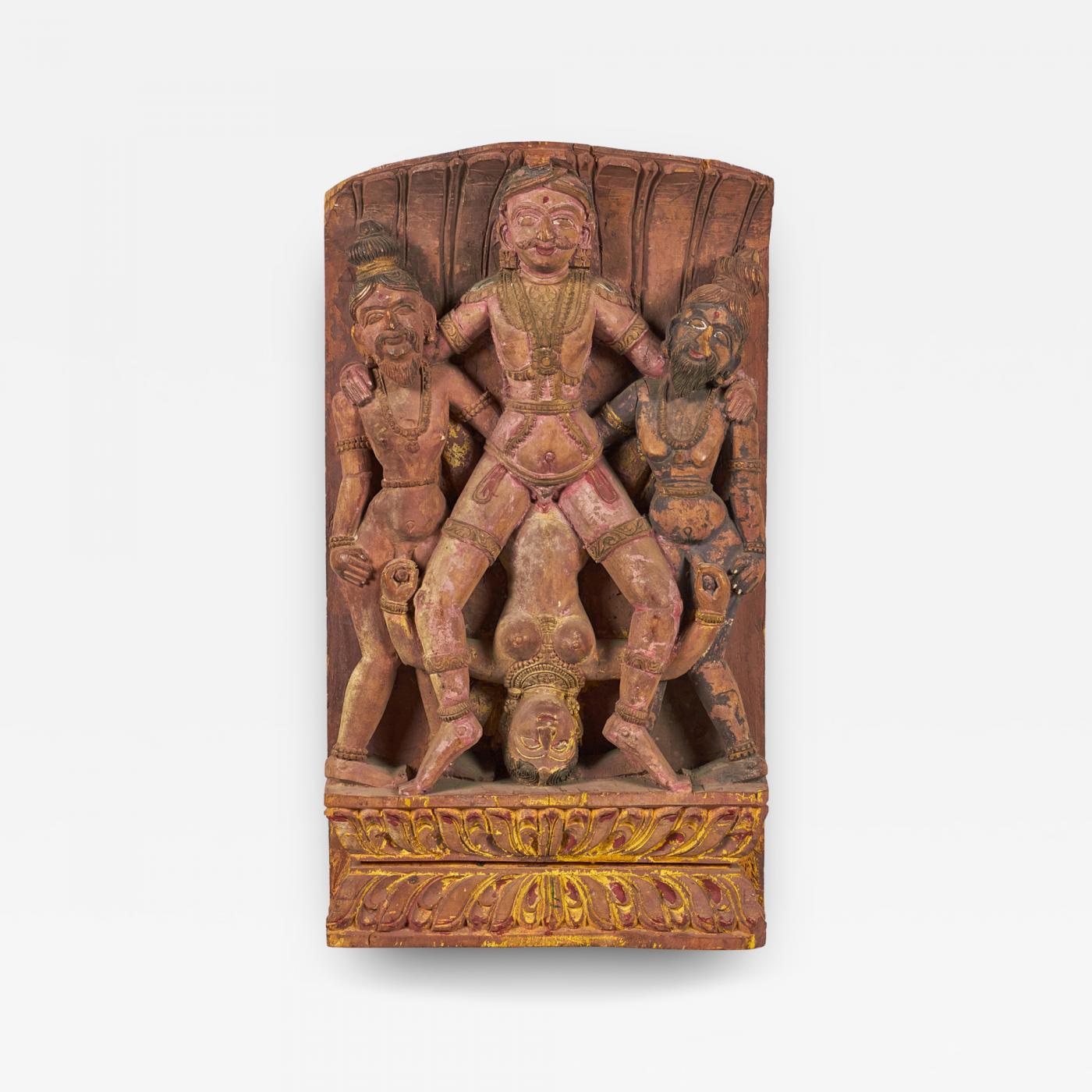 Asian Indian (19th Century) carved teak erotic wall plaque with 4 figures. From the Love Temple, Khajuraho, North India.