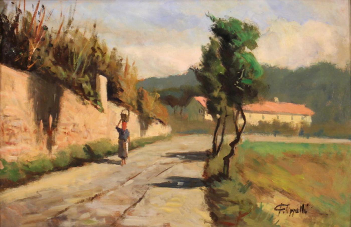 Italian painting from the mid-20th century. Oil on masonite artwork depicting a country landscape with a peasant woman of good pictorial quality. Painting of beautiful size and proportion adorned with a wooden frame with paper passe-partout (faux velvet) which has several marks and a tear in the top left corner (see photo), which needs to be replaced. Painting with pleasant depth and perspective, the painter is good at creating the shadows of the trees and of the character walking on the road (see photo). Framework signed lower right C. Filippelli (see photo) referable to the famous painter Cafiero Filippelli (1889-1973) missing authentication. Tablet exposed over time with protective glass (now missing) with still very bright colors (see photo). Painting in good condition, slightly domed panel, structurally sound frame with several signs of aging. Sight size H 32 x W 50 cm