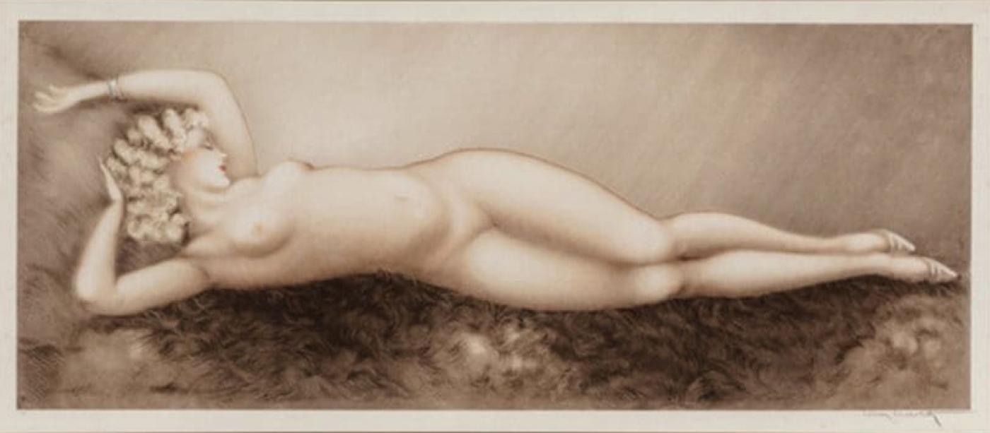 Louis Icart Etching, "Repose", 1934 -- Etching with hand coloring on wove paper. 18 x 45-1/4 inches (45.7 x 114.9 cm). Signed in pencil on the lower right.