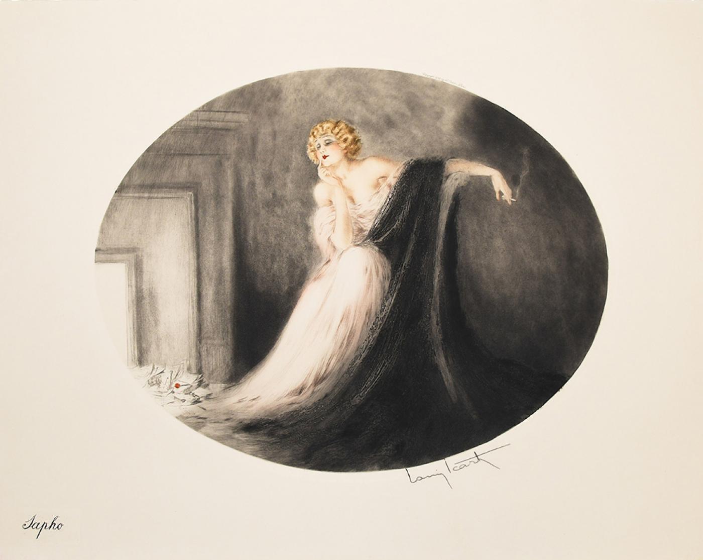 Sapho by Louis Icart. Circa 1929. Drypoint with Etching and Aquatint hand coloring on Woven paper signed in pencil in the lower right-hand corner. Windmill stamp on the lower left corner of the paper. Guaranteed authentic original Louis Icart Etching. Dimensions: 28.75" (L) x 23" (h).