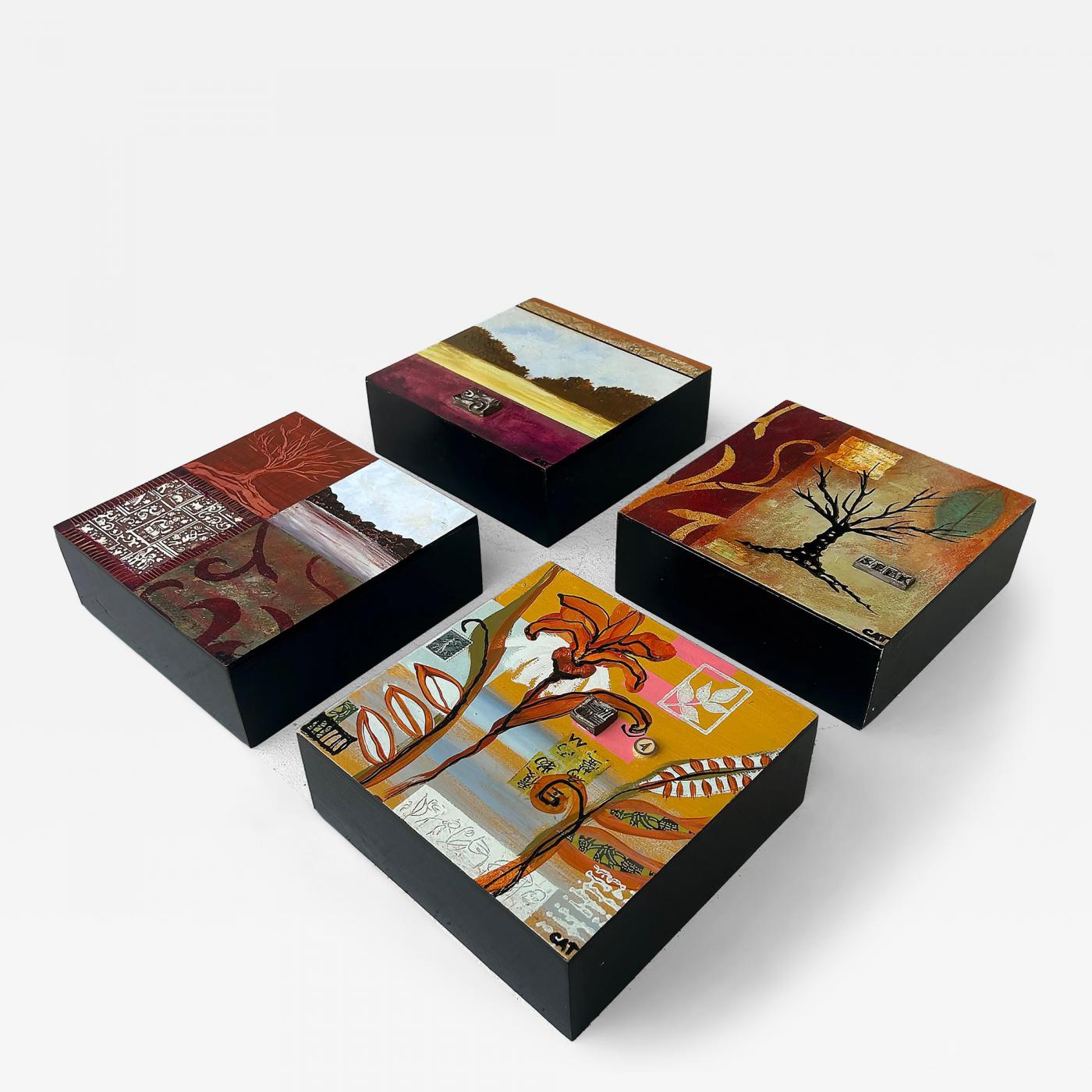 Offered for sale is a grouping of four mixed media abstract paintings by the contemporary artist Cat Tesla. Acquired from the artist, these block paintings portray nature in a graphic and creative way. They are signed and dated on the inside back of the cubes. They have a great updated Mid-century or Modern look. -