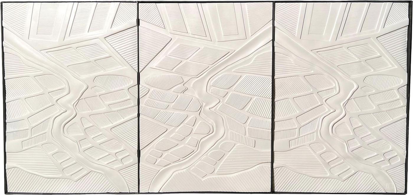 « Perspectives », large plaster wall sculpture by Brigitte Thiot, plastician artist, composed of three panels set in a blackened iron frame. Unique piece. Bears the artist’s embossed stamp.