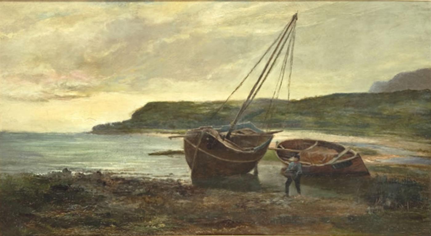 19th century oil on canvas titled "Landing the Catch" by Sam Bough R.S.A (1822-1879).
